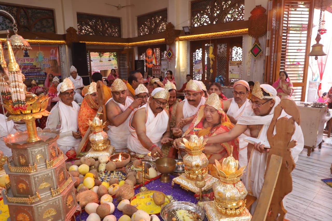 आगरा। कमला नगर शालीमार एन्क्लेव स्थित श्री 1008 पार्श्वनाथ दिगंबर जैन मंदिर में चल रहे श्री सिद्धचक्र महामंडल विधान एवं विश्वशांति महायज्ञ में शनिवार को अभिषेक शांतिधारा मनोज जैन और समकित जैन ने की और इस दिन 1024 अर्घ्य समर्पित किए गए। आज का विधान शेस्त्रनाम विधान कहा जाता है । कल सुबह हवन क्रिया के साथ ये विधान संपन्न होगा। ये विधान प्रतिष्ठाचार्य बाल ब्रह्मचारी सुनील भैया जी के निर्देशन में किया जा रहा है।