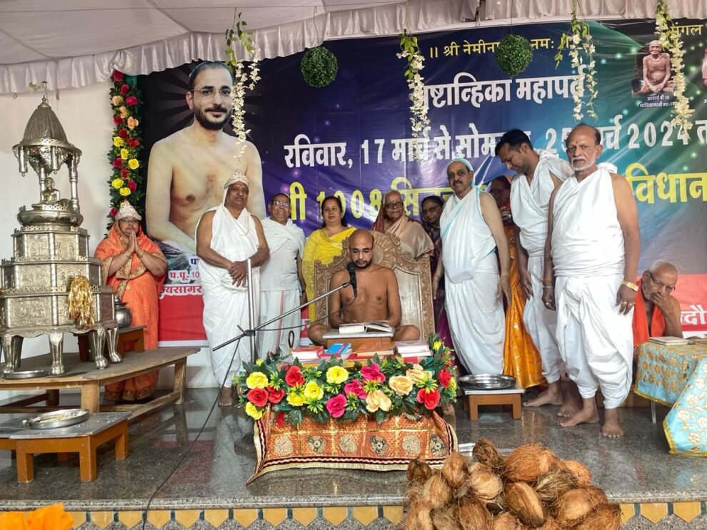अंतर्मुखी मुनि श्री पूज्य सागर महाराज और क्षुल्लक अनुश्रमण सागर महाराज के सानिध्य में नेमिनगर जैन कॉलोनी में नौ दिवसीय सिद्धचक्र मंडल विधान के पांचवे दिन सिद्धों की आराधना करते हुए 128 अर्घ्य मंडल पर समर्पित किए गए। इस अवसर पर मुनि श्री के प्रवचन भी हुए। पढ़िए यह विशेष रिपोर्ट…