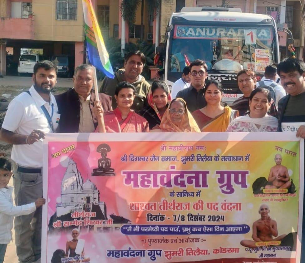 झुमरीतलैया। झुमरीतलैया जैन मोहल्ला चांडक काम्प्लेक्स श्री दिगम्बर जैन समाज के 121 श्रद्धालु भक्तजन जैन धर्म के सर्वोच्च तीर्थ सम्मेदशिखर पारसनाथ पर्वत की वंदना के लिए तीर्थ यात्रा पर निकले। श्रद्धालु भक्त जनों को पार्षद पिंकी जैन और समाज के पदाधिकारी ने जैन धर्म का झंडा दिखाकर रवाना किया।