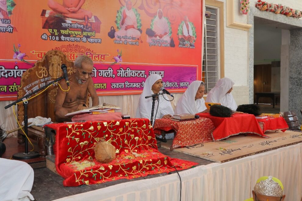 आगरा। आचार्यश्री चैत्यसागर जी महाराज ससंघ के मंगल सानिध्य में अष्टान्हिका महापर्व के पावन अवसर पर मंगलवार को मोती कटरा स्थित तार की गली के श्री पार्श्वनाथ दिगंबर जैन मंदिर वात्सल्य संत निलय में दस दिवसीय श्री सिद्धचक्र महामंडल विधान का आयोजन चल रहा है। जिसमें भक्तों ने विधान के पांचवे दिन का शुभारंभ श्रीजी का अभिषेक एवं शांतिधारा के साथ किया। इसके बाद विधानाचार्य आनन्द जैन शास्त्री के कुशल निर्देशन में सिद्ध भगवान के गुणों के अष्टद्रव्य के 132 अर्घ्य भक्तिभाव से जिनेन्द्र प्रभु के चरणों में समर्पित कर विधान की मांगलिक क्रियाएं सम्पन्न कीं।