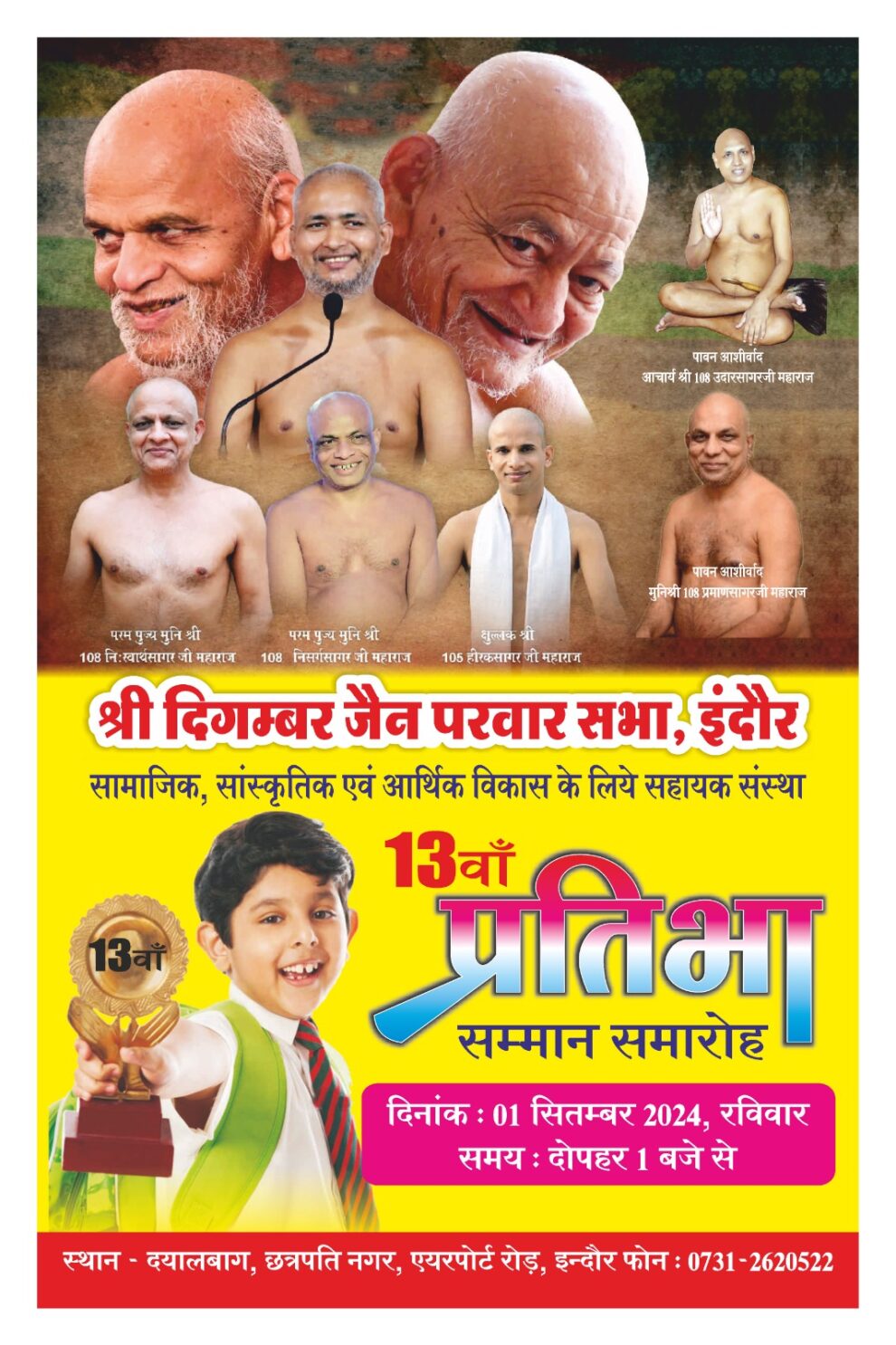 इंदौर। दिगंबर जैन परवार सभा के द्वारा समाज के जिन छात्र छात्राओं ने अपनी कक्षा में उच्च श्रेणी प्राप्त की हो एवं शासकीय सेवाओं में वर्ष 2023-24 में उच्च पदों पर नियुक्ति हुई हो, ऐसी गौरवशाली प्रतिभाओं का 13 वां सम्मान समारोह का भव्य आयोजन दलाल बाग में रविवार, 1 सितंबर 2024, दोपहर 1:00 से किया जा रहा है। उक्त कार्यक्रम पूज्य मुनि श्री प्रमाण सागर जी महाराज के आशीर्वाद एवं पूज्य मुनि श्री विनम्र सागर जी महाराज ससंघ के पावन सानिध्य में होगा।