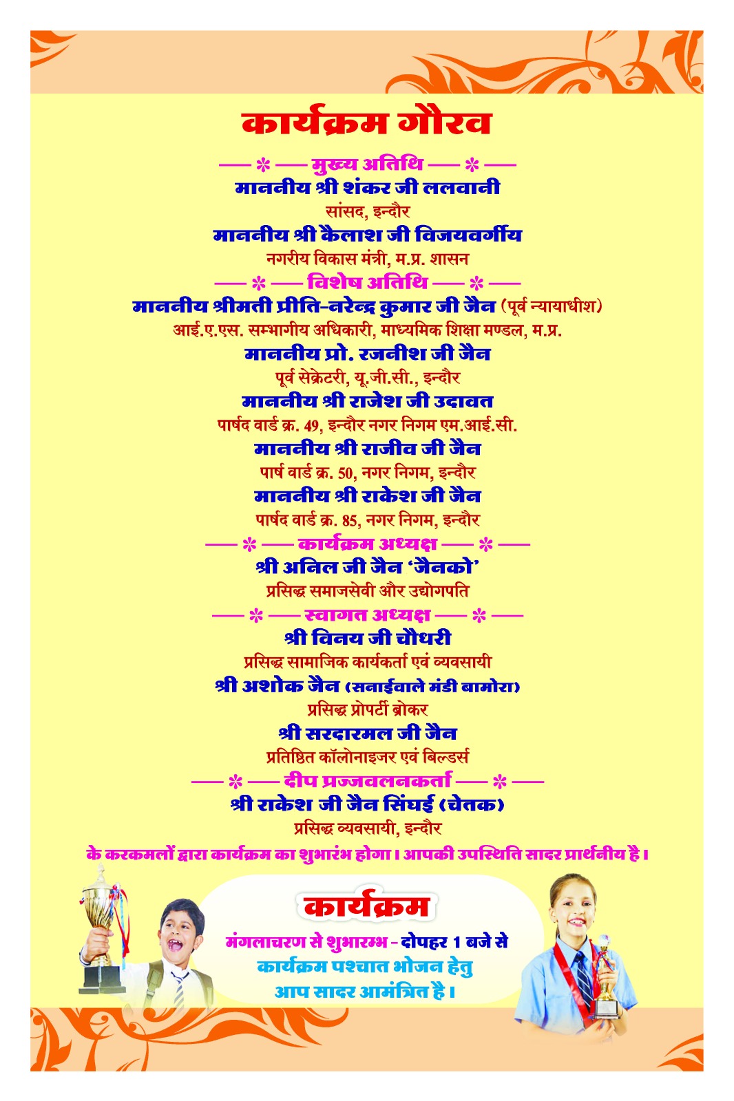 सभा के अध्यक्ष कैलाश चंद्र जैन नेता जी ने बताया कि दसवीं और बारहवीं बोर्ड की परीक्षा में सर्वोच्च अंक प्राप्त छात्र-छात्राओं को गोल्ड मेडल अनिल जैन ‘ जैनको ‘ एवं अशोक कुमार जी जैन सनाई वाले परिवार द्वारा प्रदत्त किया जाएगा। अन्य कक्षाओं में सर्वोच्च अंक प्राप्त छात्र-छात्राओं को 11 सिल्वर मेडल श्री वीरेंद्र कुमार जी सूत वाला परिवार, राजेश जैन लारेल परिवार, योगेश बांझल परिवार, अभय जैन (एडवोकेट) परिवार, संतोष – मीना जैन सर परिवार, डॉक्टर सुश्री साधना नानक चंद बांझल परिवार, अनिल – मीना रावत परिवार, मनोज सिंघई परिवार, निर्मल – शांता जी जैन परिवार , आदेश जी जैन (आबकारी अधिकारी) परिवार, स्वर्गीय डॉक्टर प्रेमचंद – विमला बाई जैन परिवार के द्वारा एवं दो नगद पुरस्कार शरद – सीमा जी रावत परिवार एवं अरुण जैन मऊरानीपुर वाला परिवार द्वारा प्रदत किए जाएंगे। कार्यक्रम के मुख्य अतिथि शंकर लालवानी, सांसद इंदौर कैलाश विजयवर्गीय नगरीय विकास मंत्री, मध्य प्रदेश शासन, होंगे। विशेष अतिथि प्रीति जैन, संभागीय अधिकारी, माध्यमिक शिक्षा मंडल म प्र, प्रोफेसर रजनीश जैन, पूर्व सेक्रेटरी यूजीसी, राजेश उदावत, एमआईसी मेंबर, राजीव जैन पार्षद वार्ड क्रमांक 50, राकेश जैन पार्षद वार्ड क्रमांक 85 होंगे। कार्यक्रम की अध्यक्षता अनिल जैन ‘ जैनको ‘ करेंगे। स्वागत अध्यक्ष विनय चौधरी, अशोक जैन, सरदार मल जैन होंगे। दीप प्रज्वलन कर्ता राकेश जैन सिंघई ‘चेतक ‘ परिवार होंगे।