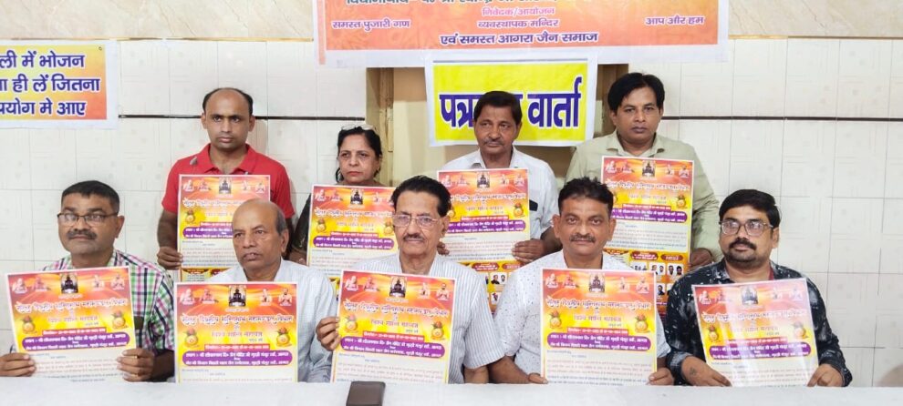 आगरा। आचार्य श्री सौरभ सागर जी महाराज के आशीर्वाद एवं प्रेरणा से गुदड़ी मंसूर खां स्थित श्री 1008 शीतलनाथ दिगंबर जैन मंदिर में 25 जुलाई से 9 अगस्त तक शांतिनाथ महामंडल विधान एवं विश्व शांति महायज्ञ किया जा रहा है। विधान की सारी तैयारियां पूर्ण हो चुकी हैं। इसको लेकर सोमवार को गुदड़ी मंसूर खां के श्री शीतल नाथ दिगंबर जैन मंदिर में पत्रकार वार्ता आयोजित की गई। इस अवसर पर मंदिर के सभी पुजारियों ने विधान की पत्रिका का विमोचन किया। मंदिर व्यवस्थापक सुभाष जैन ने कहा कि विधान का शुभारंभ 25 जुलाई को प्रातः6 बजे देवआज्ञा 7 बजे घटयात्रा एवं ध्वजारोहण, जाप शाला प्रतिष्ठा, इंद्र, मंडप प्रतिष्ठा, शांतिधारा के साथ होगा। घटयात्रा गुदड़ी मंसूर खां जैन मंदिर से प्रारंभ होकर विभिन्न मार्गांे से होती हुई वापस जैन मंदिर पहुंचेगी। जहां वीरेंद्र कुमार जैन नायक एवं विपिन कुमार जैन परिवार द्वारा ध्वजारोहण किया जाएगा। विधान की सभी मांगलिक क्रियाएं पंडित रविंद्र जैन शास्त्री एवं पंडित सौरभ जैन शास्त्री संगीतमय करवाएंगे।