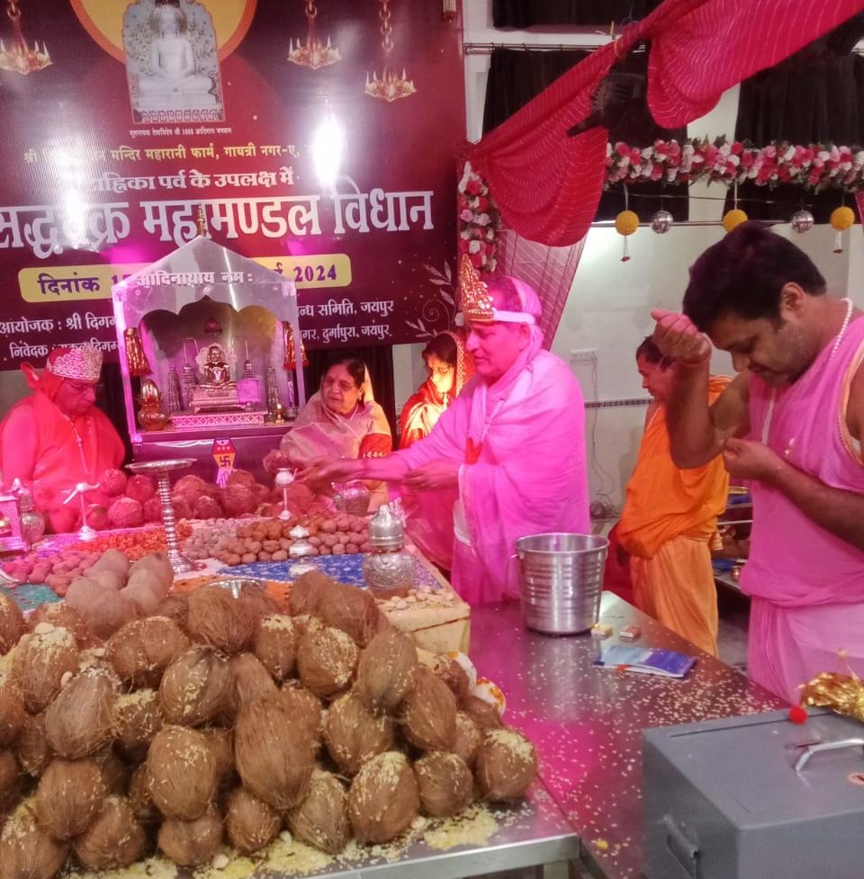 श्री दिगंबर जैन मंदिर गायत्री नगर, महारानी फार्म में आयोजित सिद्ध चक्र महामंडल विधान के पांचवें दिन 21 मार्च को नित्य नियम की पूजा व शांति धारा के पश्चात 256 अर्घ्य भक्ति भाव से समर्पित किए गए। पढ़िए यह विशेष रिपोर्ट…