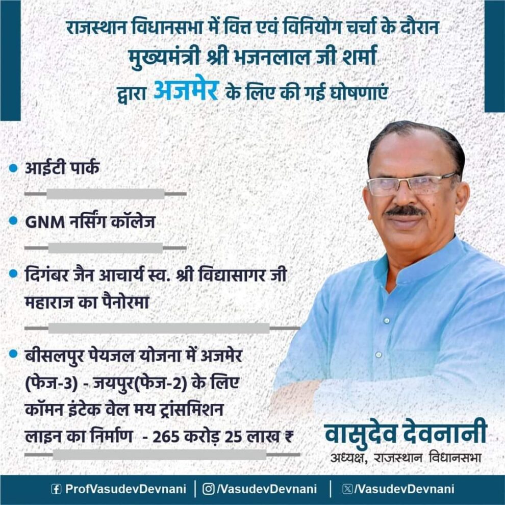 अजमेर में महामहिम आचार्य श्री विद्यासागर जी महाराज का पैनोरमा बनाने की घोषणा की गई है।राजस्थान के मुख्यमंत्री भजनलाल शर्मा जी एवं राजस्थान विधानसभा अध्यक्ष एवं अजमेर उत्तर विधायक वासुदेव देवनानी बनेगा। पढ़िए राजेश जैन दद्दू की रिपोर्ट…
