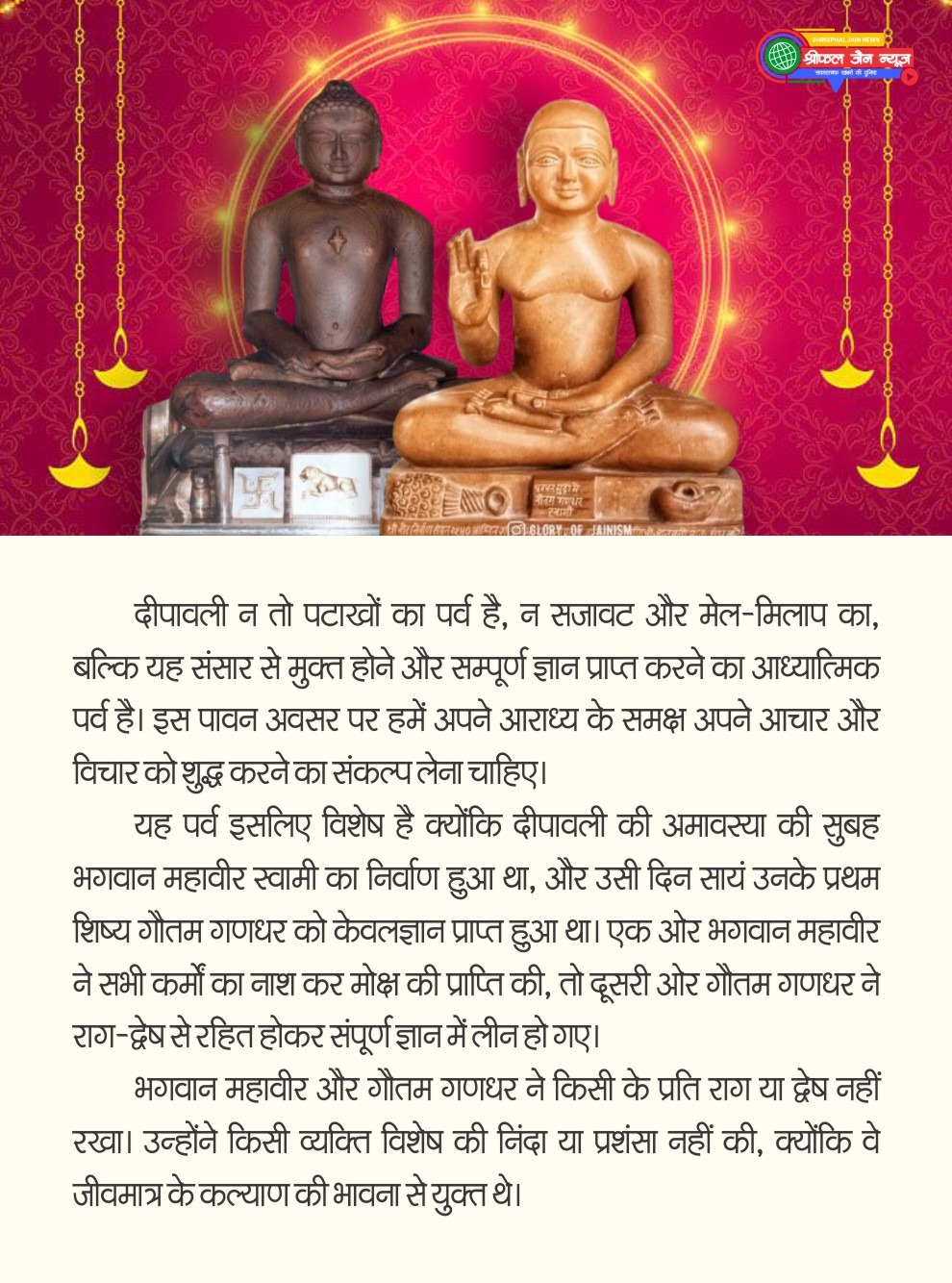 दीपावली न तो पटाखों का पर्व है, न सजावट और मेल-मिलाप का, बल्कि यह संसार से मुक्त होने और सम्पूर्ण ज्ञान प्राप्त करने का आध्यात्मिक पर्व है। इस पावन अवसर पर हमें अपने आराध्य के समक्ष अपने आचार और विचार को शुद्ध करने का संकल्प लेना चाहिए। दीपोत्सव के अवसर पर पढ़िए, सम्पादक रेखा संजय जैन का यह आलेख