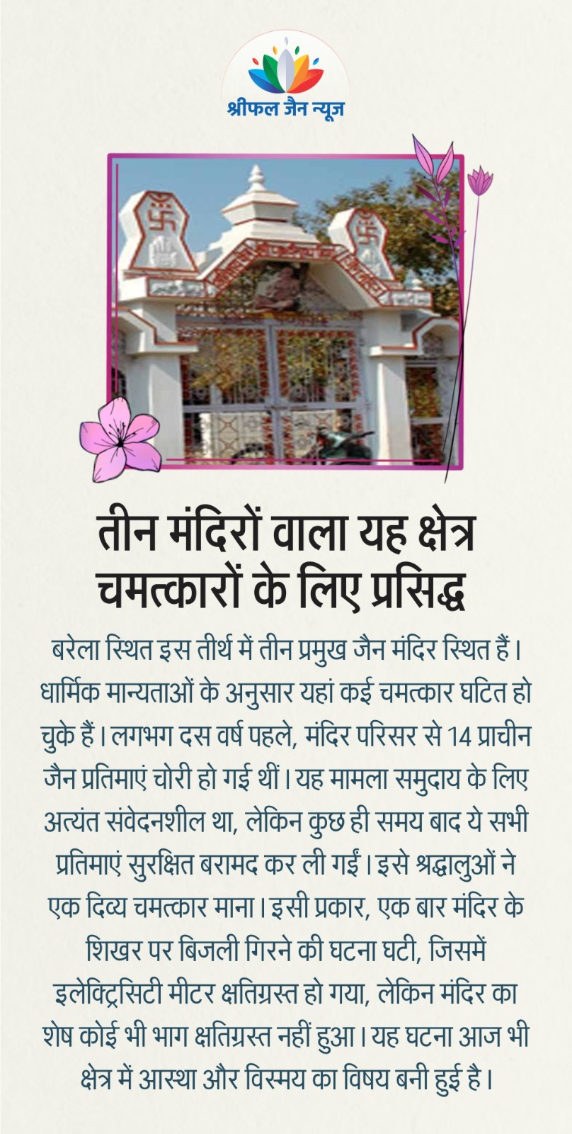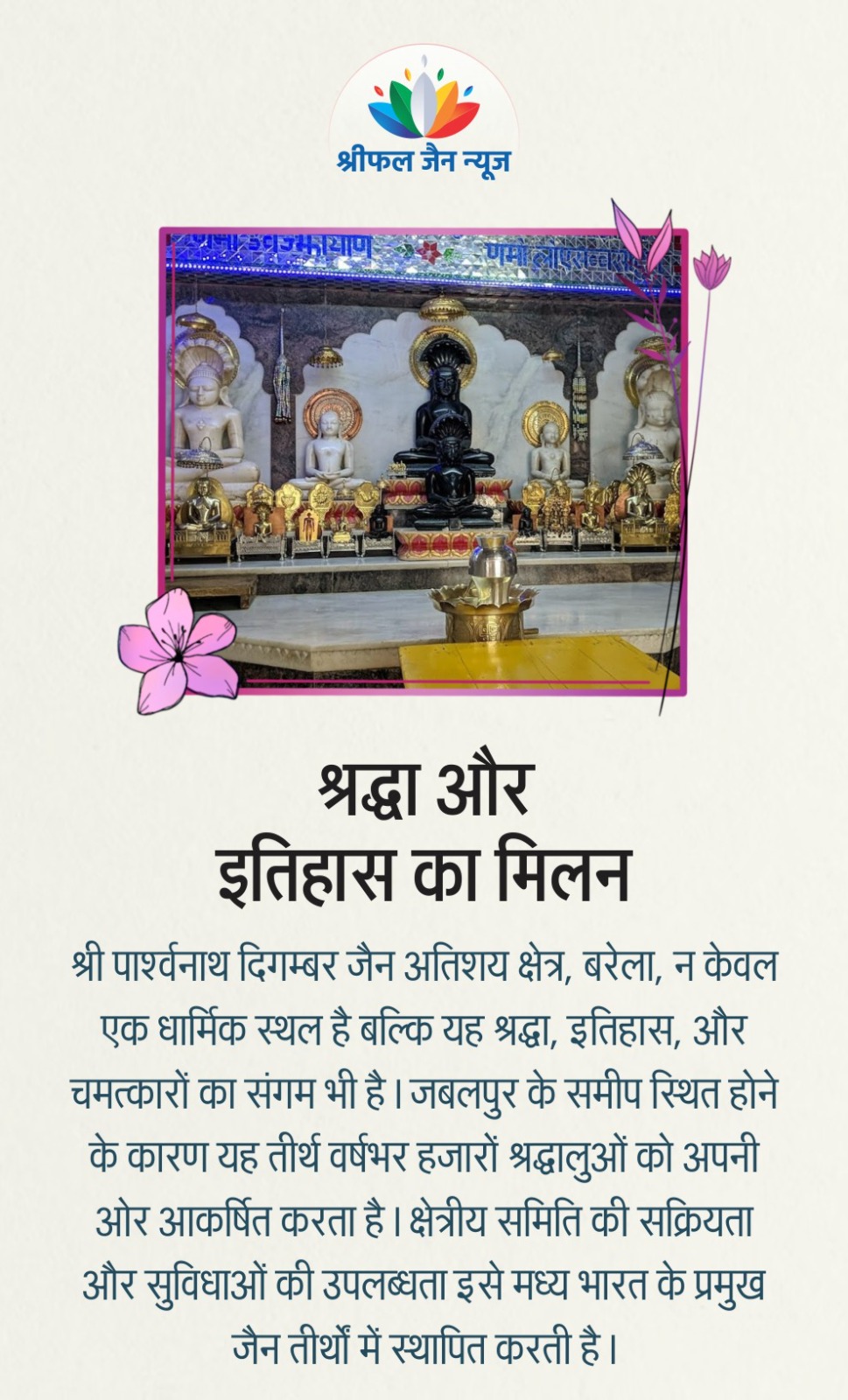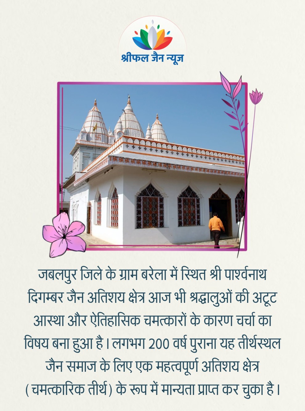 जैन अतिशय क्षेत्र जैन धर्म के अत्यंत महत्वपूर्ण तीर्थ स्थल हैं। इन क्षेत्रों में जैन धर्म के भगवान महावीर और उनके पूर्वकल्याणकारक जिनेन्द्र देव के आध्यात्मिक लीलाओं के अतिशय (अद्भुत) घटनाएं मान्यता प्राप्त हैं। इन स्थलों पर जैन समुदाय के श्रद्धालु भक्तिभाव से पूजा-अर्चना करते हैं और ध्यान धरते हैं। भारत के कुछ अतिशय क्षेत्रों की जानकारी दे रही हैं श्रीफल जैन न्यूज की संपादक रेखा जैन। इसकी 47वीं कड़ी में आज पढ़िए जबलपुर जिले के ग्राम बरेला में स्थित श्री पार्श्वनाथ दिगम्बर जैन अतिशय क्षेत्र के बारे में …