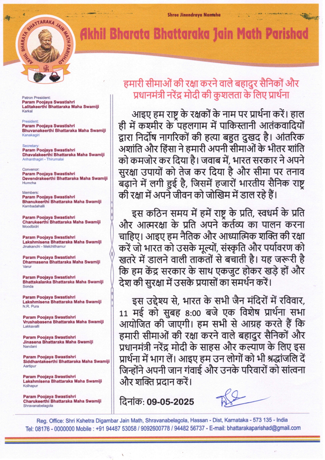 हुमचा। अखिल भारतीय भट्टारक जैन मठ परिषद ने आगामी रविवार, 11 मई 2025 को प्रातः 8:00 बजे देशभर के सभी जैन मंदिरों में एक विशेष प्रार्थना सभा आयोजित करने की घोषणा की है। इस आयोजन का उद्देश्य जम्मू-कश्मीर के पहलगाम में हाल ही में पाकिस्तानी आतंकवादियों द्वारा निर्दोष नागरिकों की हत्या के बाद देश की सीमाओं की रक्षा में लगे बहादुर सैनिकों और प्रधानमंत्री नरेंद्र मोदी की कुशलता के लिए प्रार्थना करना है। परिषद के संरक्षक अध्यक्ष परम पूज्य स्वस्तिश्री ललितकीर्ति भट्टारक महास्वामीजी, अध्यक्ष परम पूज्य स्वस्तिश्री भुवनकीर्ति भट्टारक महास्वामीजी, सचिव परम पूज्य स्वस्तिश्री धवलकीर्ति भट्टारक महास्वामीजी, और संयोजक परम पूज्य स्वस्तिश्री देवेंद्रकीर्ति भट्टारक महास्वामीजी ने इस अवसर पर सभी जैन समाजजनों से अपील की है कि वे इस प्रार्थना सभा में भाग लेकर राष्ट्र की सुरक्षा और शांति के लिए अपनी श्रद्धा अर्पित करें।