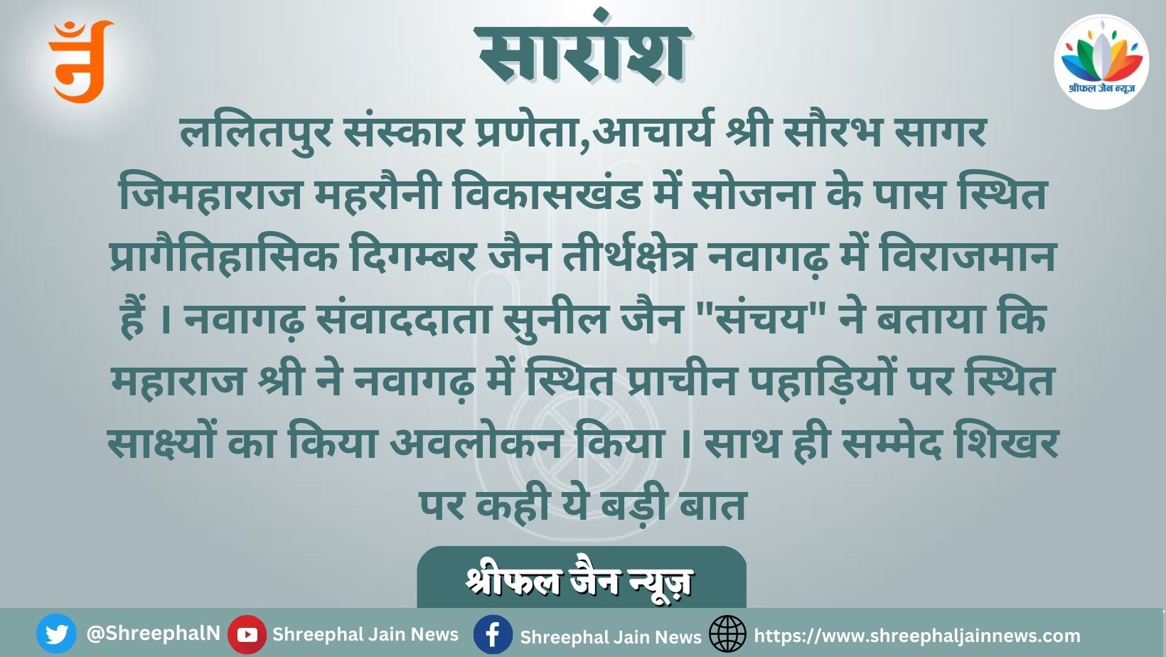 नवागढ़ तीर्थक्षेत्र के प्रचारमंत्री डॉ सुनील संचय ललितपुर ने बताया कि आचार्य श्री सौरभ सागर महाराज जी के मंगल सानिध्य में शिखरजी के संरक्षण हेतु प्रागैतिहासिक क्षेत्र नवागढ़ जी में विधान का आयोजन 22 दिसंबर को संपन्न किया जा रहा है जिसमें समस्त क्षेत्रीय समाज मूल नायक अरनाथ भगवान के श्रीचरणों में सम्मेद शिखर के ऊपर आए हुए संकट को दूर करने का भाव करते हुए विधान विधि विधान के साथ किया जाएगा ।