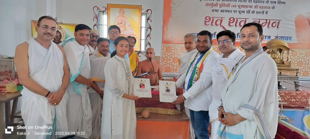 सनावद। सकल जैन समाज द्वारा जिन शासन नायक भगवान महावीर स्वामी के जन्म कल्याणक पर दो दिवसीय आयोजन किए जा रहे हैं। बुधवार ब्रह्म मुहूर्त में अंतर्मुखी मुनि पूज्य सागर जी महाराज ने केशलोचन किए। बड़ा मंदिरजी में प्रातः श्रीजी के अभिषेक शांति धारा हुई। जिसमें प्रथम कलश करने का सौभाग्य नंदलाल जैनी को प्राप्त हुआ। शांति धारा करने का सौभाग्य विशाल कुमार भाई वैभवकुमार सराफ परिवार को प्राप्त हुआ। श्री वर्धमान संत नीलय में श्रीफल न्यूज़ परिवार की ओर से समाज में उत्कृष्ट सेवा एवं धार्मिक गतिविधियों की जानकारी के प्रचार-प्रसार के लिए प्रवक्ता सन्मति जैन काका को माला दुपट्टा एवं प्रशस्ति पत्र से सम्मानित किया गया। छोटी उम्र में इंटरनेट के माध्यम से महाराज श्री के प्रवचन एवं क्लास को घर-घर तक पहुंचाकर धर्म प्रभावना के लिए गवाक्षी हेमेंद्रकुमार जैन को भी माला दुपट्टा एवं प्रमाण पत्र देकर अभिनंदित किया गया। उसके उपरांत श्री वर्धमान संत निलय में भगवान महावीर मनोकामना सिद्धि महामंडल विधान के रूप में भव्याति भव्य महापूजा अंतर्मुखी मुनि श्री पूज्य सागर महाराज के मार्गदर्शन में की गई। जिसमें सौधर्म इंद्र बनने का सौभाग्य श्रीकांत प्रीति जटाले परिवार को प्राप्त हुआ।