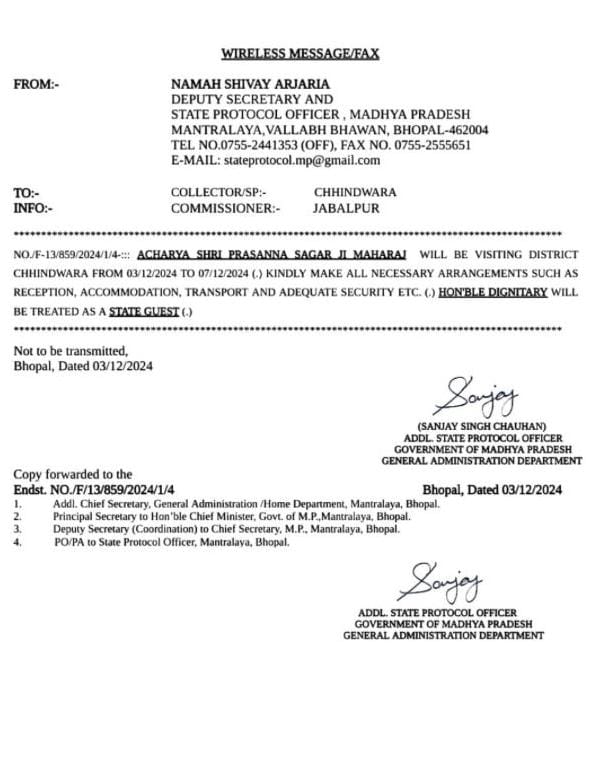 इंदौर। दिगम्बर जैन संत अन्तर्मना आचार्य श्री प्रसन्न सागर जी महाराज को मध्यप्रदेश सरकार ने राजकीय अतिथि घोषित कर गौरव प्रदान किया है। अन्तर्मना संघ के कोर्डिनेटर डॉ. संजय जैन ने उक्त जानकारी देते हुए बताया कि प्रदेश के यशस्वी मुख्यमंत्री माननीय डॉ. मोहन जी यादव, केबिनेट मंत्री माननीय कैलाश जी विजयवर्गीय ने भारतवर्षीय तीर्थ क्षेत्र कमेटी मध्यांचल के अध्यक्ष डी.के. जैन जी के प्रस्ताव पर आचार्य श्री को प्रदेश का राजकीय सम्मान प्रदान किया है।