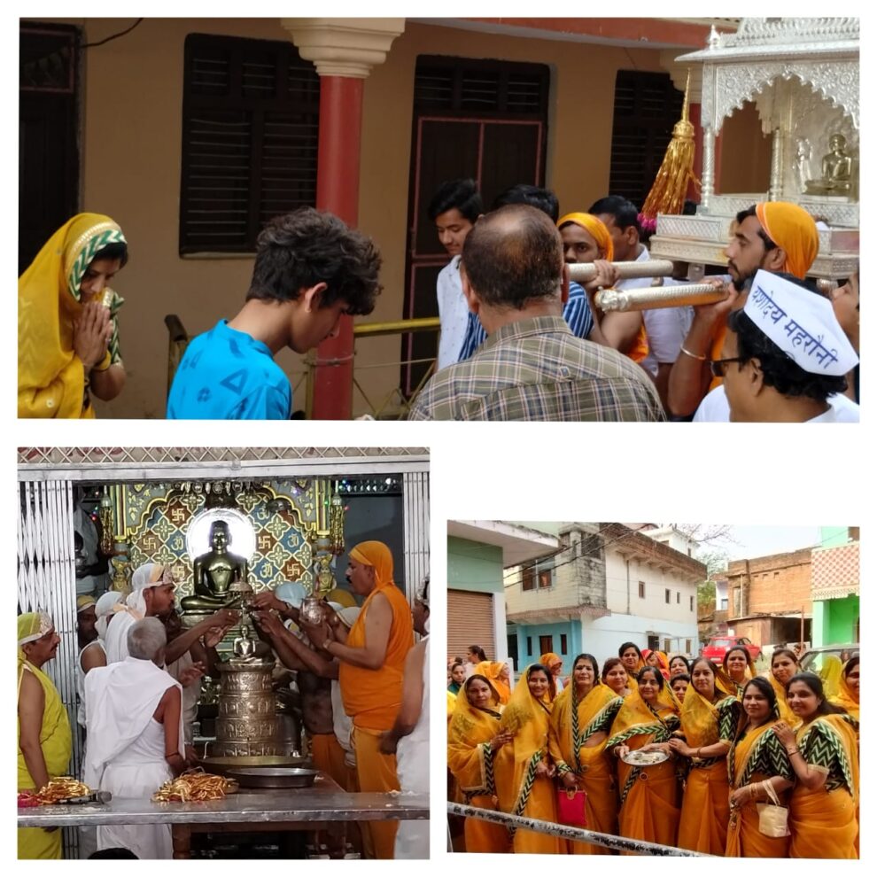 उनके पीछे सैकड़ों इंद्र-इंद्राणी पीले वस्त्रों में चल रहे थे। शोभायात्रा के विमान में श्रीजी विराजमान थे। सभी ने अपने-अपने द्वार पर भगवान की आरती उतारी। शोभायात्रा का समापन के बाद भगवान आदिनाथ का अभिषेक और शांतिधारा हुई। प्रथम अभिषेक करने का सौभाग्य राजेश खिमलासा और अनिल मिठया को तथा शांतिधारा करने का सौभाग्य शिखर चंद्र मिठया और प्रमोद सिंघई परिवार को प्राप्त हुआ। मूलनायक पर ध्वजारोहण प्रवीण सिंघई ने किया।
