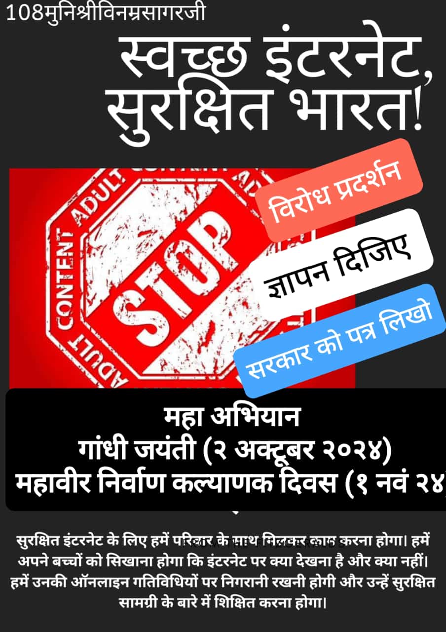 उक्त बातें आचार्य श्री विद्यासागर जी महाराज के परम प्रभावक शिष्य मुनि श्री विनम्र सागर जी ने अहिंसा दिवस पर “स्वच्छ इंटरनेट सुरक्षित देश” अभियान की शुरुआत करते हुए कही उन्होंने आगे कहा कि यह अभियान किसी एक संत, एक समाज अथवा क्षेत्र का नहीं है यह तो जन जन का अभियान है सभी संत महात्मा, मौलवी, धर्मगुरुओं का है। वे सभी आगे आकर अपनी सत्य अहिंसामय संस्कृति को बचाएं। यह अभियान बंद नहीं होना चाहिए जब तक कोई ठोस कानूनी कार्रवाई नहीं हो जाएं।