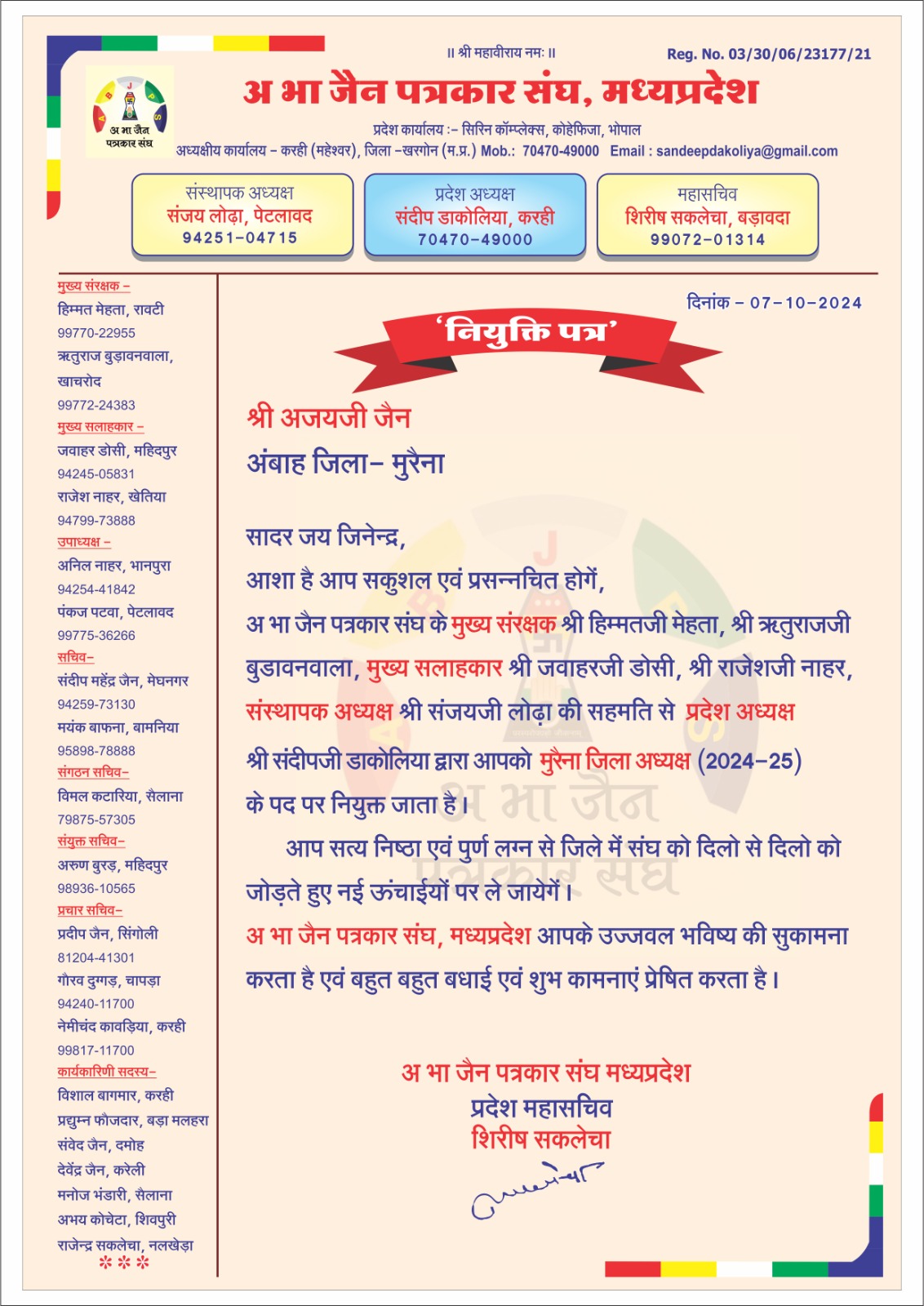 मुरैना। अम्बाह नगर के युवा समाजसेवी और वरिष्ठ पत्रकार अजय जैन को अखिल भारतीय जैन पत्रकार संघ का मुरैना जिला अध्यक्ष मनोनीत किया गया है। यह नियुक्ति अ.भा.जैन पत्रकार संघ के मुख्य संरक्षक हिम्मत मेहता, ऋतुराज बुडावनवाला, मुख्य सलाहकार जवाहर डोसी, राजेश नाहर, और संस्थापक अध्यक्ष संजय लोढ़ा की सहमति से की गई है। प्रदेश अध्यक्ष संदीप डाकोलिया ने यह घोषणा की, जिसे प्रदेश महासचिव शिरीष सकलेचा ने लिखित पत्र के माध्यम से साझा किया।