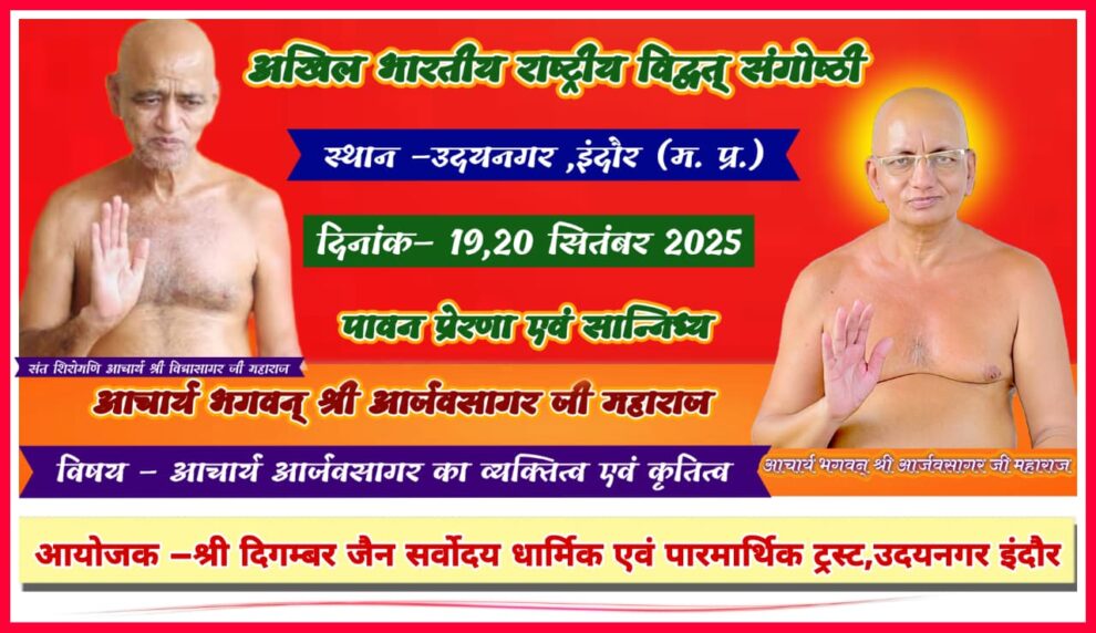 श्री चंद्रप्रभु दिगंबर जैन मंदिर उदयनगर में आचार्य श्री आर्जवसागर जी ससंघ के मंगल सान्निध्य में अखिल भारतीय राष्ट्रीय विद्वत् संगोष्ठी 19-20 सितंबर को होगी। संगोष्ठी का विषय ‘आचार्य आर्जवसागर का व्यक्तित्व एवं कृतित्व निर्धारित किया गया है। विद्वत परिषद् के विद्वानों को आमंत्रित किया गया है। इंदौर से पढ़िए, भानूकुमार जैन की यह खबर…