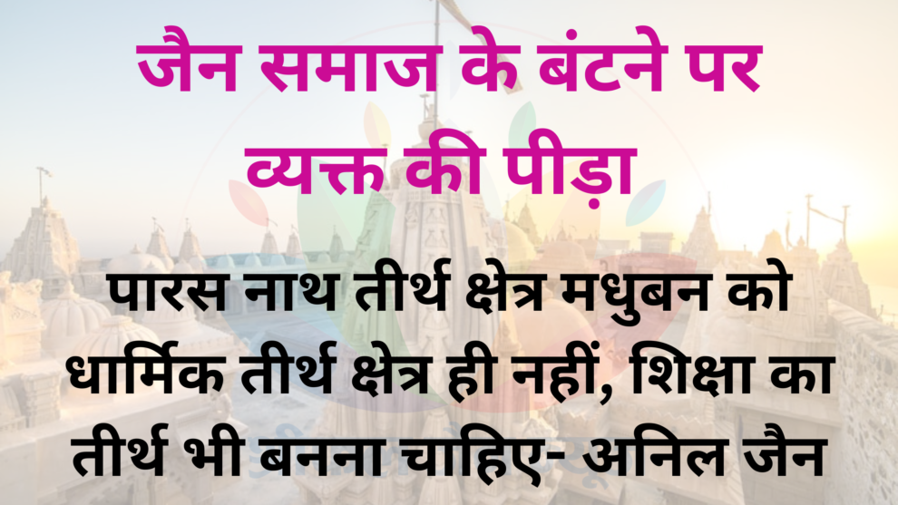 जैन समाज के बंटने पर व्यक्त की पीड़ा : पारस नाथ तीर्थ क्षेत्र मधुबन को धार्मिक तीर्थ क्षेत्र ही नहीं, शिक्षा का तीर्थ भी बनना चाहिए- अनिल जैन