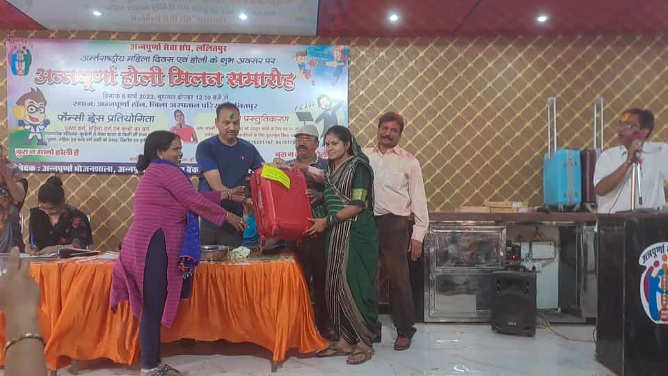 ललितपुर। अन्नपूर्णा सेवा संघ द्वारा अन्नपूर्णा हॉल जिला अस्पताल परिसर में अंतरराष्ट्रीय महिला दिवस एवं होली के अवसर पर आयोजित अन्नपूर्णा होली मिलन समारोह की प्रतियोगिताओं में बच्चों की फैंसी ड्रेस में कुमारी अनन्या मलैया को प्रथम, मास्टर अविरल को द्वितीय एवं कुमारी प्रीशा को तृतीय पुरस्कार मिला। लेडीज फैंसी ड्रेस में कुमारी नीलू जैन को प्रथम, अंजना नामदेव को दूसरा एवं दीप्ति जैन को तृतीय पुरस्कार उनके प्रदर्शन के आधार पर दिया गया और अन्नपूर्णा टैलेंट हंट में कृष्ण कांत साहू पत्रकार को प्रथम, अंजना नामदेव को द्वितीय, प्रमोद सक्सेना एडवोकेट को तृतीय, दर्शन सेन को चतुर्थ एवं डॉ सौरव देबलिया को पांचवा पुरस्कार उनकी प्रस्तुति के लिए दिया गया।