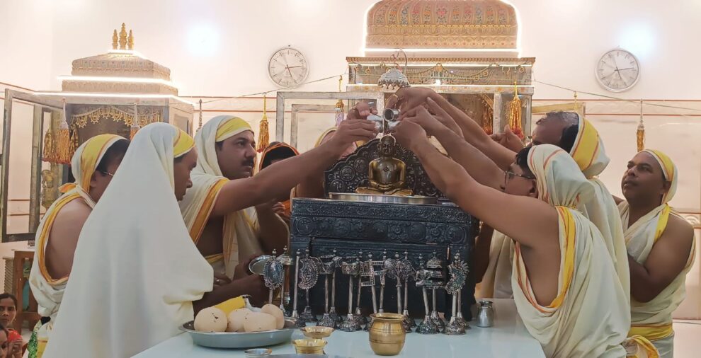 आगरा। हरीपर्वत स्थित श्री शांतिनाथ दिगंबर जैन मंदिर में मेडिटेशन गुरु उपाध्यायश्री विहसंत सागर जी महाराज ससंघ के मंगल सानिध्य में वार्षिक कलशाभिषेक महोत्सव का आयोजन किया गया। कार्यक्रम का शुभारंभ दोपहर 2:00 बजे भक्तों ने संगीतकार शशि एंड पार्टी के मधुर भजनों के साथ अष्ट द्रव्यों से श्रीजी की पूजन करके किया। पूजन के बाद, मथुरा से पधारे जिनेंद्र जैन शास्त्री के कुशल निर्देशन में श्रीजी की प्रतिमा को पाण्डुक शिला पर विराजमान कर स्वर्ण कलशों से अभिषेक सम्पन्न किया गया। उपाध्यायश्री ने अपने हाथों से सभी भक्तों को गंधोदक लगाकर मंगल आशीर्वाद दिया।