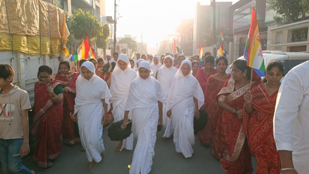 आगरा। आर्यिका श्री पूर्णमति माताजी ससंघ ने श्री आदिनाथ दिगंबर जैन मंदिर नॉर्थ ईदगाह कॉलोनी से 26 मार्च को मंगल विहार कर ओल्ड ईदगाह कॉलोनी स्थित श्री पार्श्वनाथ दिगंबर जैन मंदिर में मंगल प्रवेश किया। जहां ओल्ड ईदगाह जैन समाज ने शोभायात्रा के साथ आर्यिका श्री संघ का भव्य स्वागत किया और साथ ही पाद प्रक्षालन एवं मंगल आरती कर मंगल आशीर्वाद प्राप्त किया। आर्यिका ससंघ ने मूलनायक भगवान पार्श्वनाथ के दर्शन किए। इसके बाद मंदिर प्रांगण में उनके मंगल सानिध्य में धर्मसभा हुई। इस दौरान बाहर से पधारे जैन समाज के लोगों ने आर्यिका श्री संघ को श्रीफल भेंट किए।
