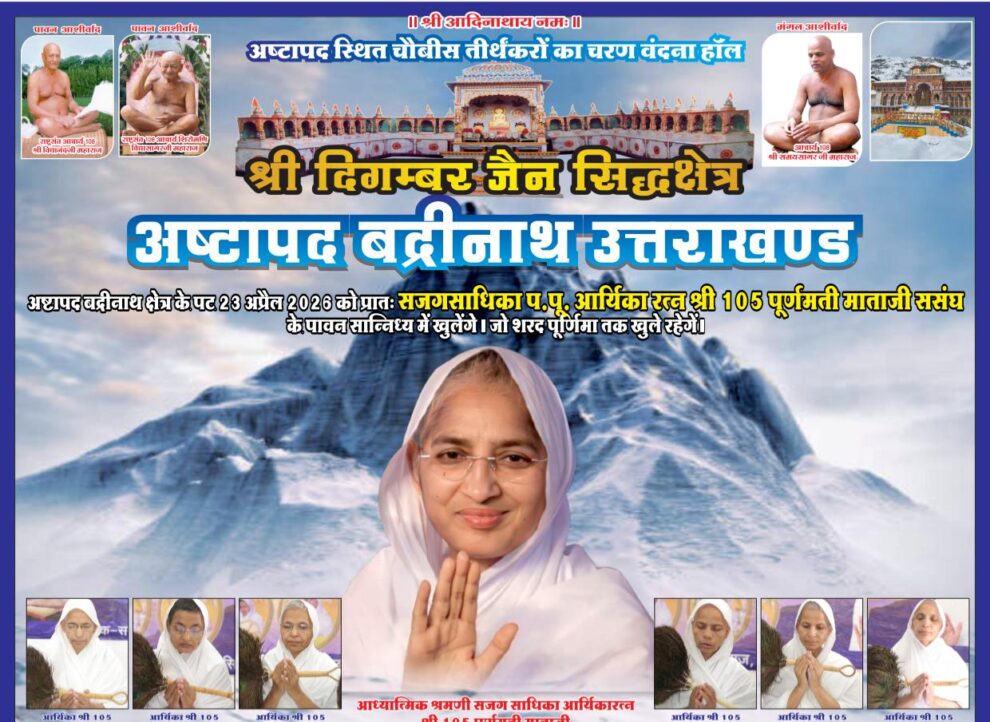 अष्टापद-बद्रीनाथ सिद्धक्षेत्र में 23 अप्रैल 2026 से पावन कपाट खुलेंगे। आर्यिका रत्न श्री 105 पूर्णमती माताजी के सानिध्य में यह आयोजन होगा, जहां श्रद्धालु शरद पूर्णिमा तक दर्शन कर सकेंगे। देशभर से बड़ी संख्या में भक्तों के आने की संभावना है। — रिपोर्ट: रेखा जैन