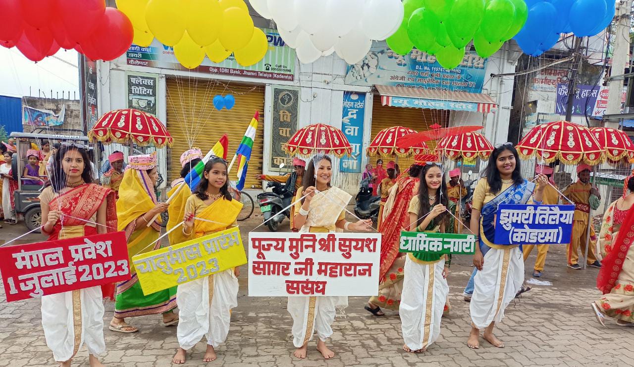 झुमरीतिलैया। परम तपस्वी जैन संत मुनि श्री 108 सूयश सागर महाराज का भव्य मंगल प्रवेश झुमरीतिलैया धर्म नगरी में हुआ। भक्तजन उनके आगमन पर खुशी और हर्ष से पुलकित हो गए। जैन समाज के हजारों महिलाएं, पुरुष, बच्चे केसरिया- श्वेत और पारंपरिक परिधान में गुरुदेव की अगवानी के लिए पहुंचे। चांडक कॉन्प्लेक्स के पास भक्तजनों ने गुरुदेव के चरण पखारे। भव्य शोभायात्रा मैं गुरुदेव के साथ ललपनिया ताशा पार्टी, बैंड बाजा, जैन स्कूल बच्चों का बैंड, महिलाओं की कलश यात्रा, भक्तजन जैन धर्म का ध्वज लिए चल रहे थे। जैन धर्म के जयकारों के साथ पूरे शहर में भक्ति और श्रद्धा का वातावरण बन गया। छोटे-छोटे बच्चे साइकिल पर थे, बालिकाएं डांडिया नृत्य के साथ हाथ में गैस के गुब्बारे के साथ थीं। महिलाएं हाथ में जैन धर्म का झंडा लेकर अपनी भक्ति को प्रदर्शित कर रहे थे। गुरुदेव के साथ-साथ भक्तजनों ने केसरिया वस्त्र में भगवान को भी पालकी में विराजमान कर नगर भ्रमण कराया। भव्य जुलूस बड़ा मंदिर स्टेशन रोड पहुंचा, जहां पर सैकड़ों श्रद्धालु भक्तों ने गुरुदेव के चरणों को धोया और अपने माथे पर लगाया। शिरोमणि आचार्य श्री 108 विशुद्ध सागर महाराज के परम प्रभावक अध्यात्म योगी श्री 108 सूयश सागर जी की अगवानी में सम्पूर्ण जैन समाज ही नहीं, स्थानीय सभी समाज ने श्रद्धालुओं ने पुष्पवर्षा, जगह-जगह पाद प्रक्षालन और आरती की। गुरुदेव के मंगल प्रवेश पर छत्तीसगढ़ से सैकड़ों भक्तजन कोडरमा नगरी पहुंचे। भक्तजनों ने भगवान के चरणों में दीप प्रज्वलित किया और गुरुदेव को शास्त्र भेंट किया।