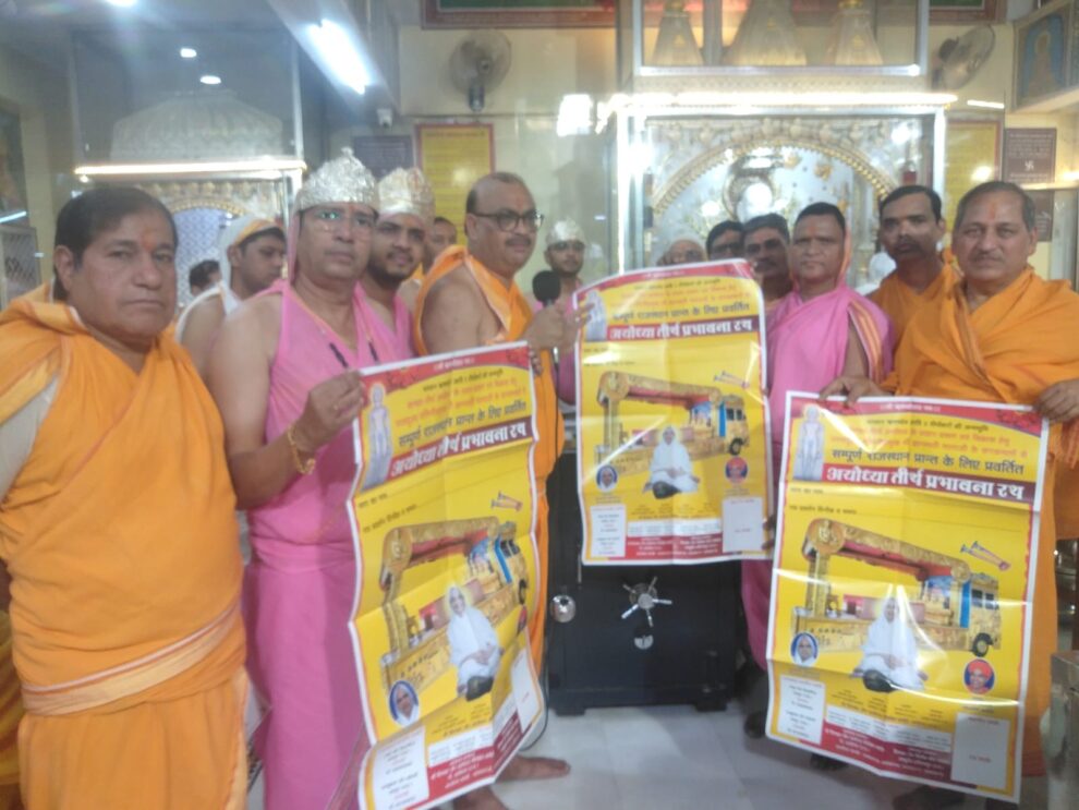 जयपुर। जैन समाज के सर्वोच्च साध्वी गणिनी प्रमुख श्री ज्ञानमति माताजी की प्रेरणा व आशीर्वाद से तीर्थंकर ऋषभदेव ,अजितनाथ, संभवनाथ, सुमतिनाथ ,अनंतनाथ आदि पांच तीर्थंकरों की जन्मभूमि शाश्वत तीर्थ अयोध्या से प्रवर्तित अयोध्या तीर्थ प्रभावना रथ का जयपुर महानगर के गायत्री नगर महारानी फार्म में 3 अप्रैल आदिनाथ जयंती के पावन अवसर पर भव्य स्वागत किया जाएगा। इसके लिए रथ प्रवर्तन राजस्थान प्रांत के संयोजक उदयभान जैन व दिलीप जैन ने मंदिर प्रबंध समिति के अध्यक्ष कैलाश छाबड़ा, उपाध्यक्ष अरुण शाह, मंत्री राजेश बोहरा से मिलकर पोस्टर का विमोचन कराया।