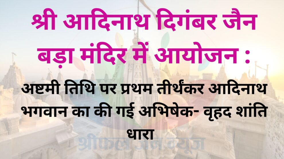 श्री आदिनाथ दिगंबर जैन बड़ा मंदिर पंचायत ट्रस्ट, मालवीय रोड की ओर से श्री आदिनाथ दिगंबर जैन बड़ा मंदिर में प्रथम तीर्थंकर श्री आदिनाथ भगवान का रजत कलश से अभिषेक किया गया। पढ़िए प्रणीत जैन की रिपोर्ट…
