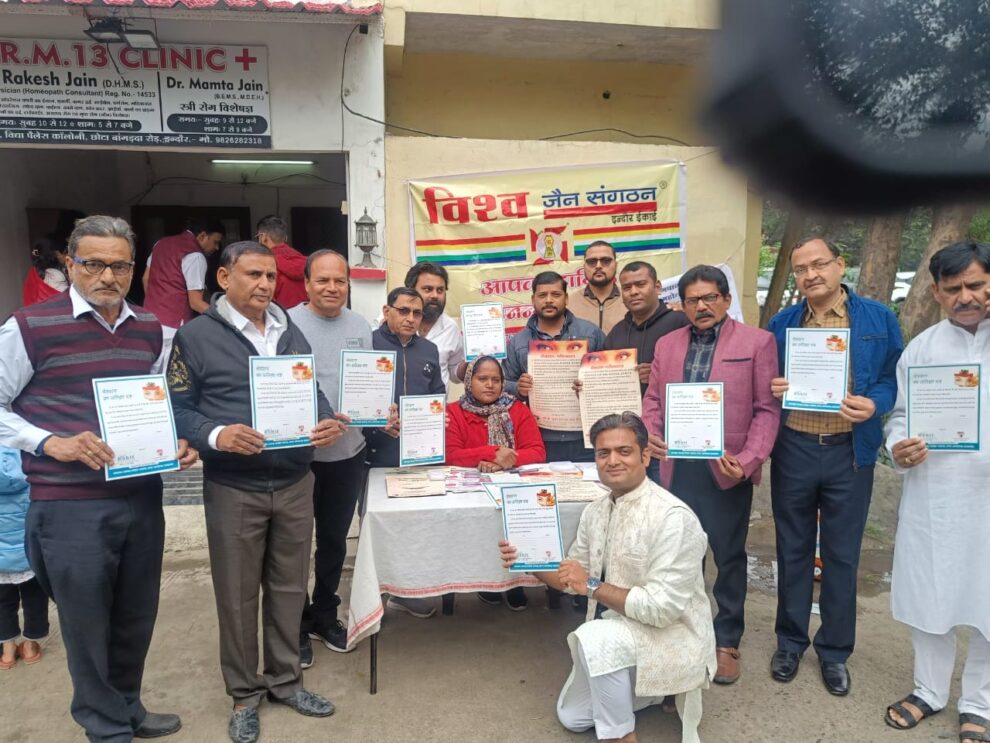 विश्व जैन संगठन इंदौर के माध्यम से विद्या पैलेस पर इंडियन रेड क्रॉस ब्लड डोनेशन के माध्यम से कैंप लगाया गया, जिसमें युवाओं और महिलाओं ने ब्लड डोनेट किया एवं नेत्र दान के लिए भी मृत्यु पश्चात सहमति प्रदान करने के लिए फॉर्म सोसाइटी को प्रदान किए। विश्व जैन संगठन इंदौर के अध्यक्ष मयंक जैन, महेंद्र पहाड़िया उपाध्यक्ष, ओम पटौदी महामंत्री, अभय सिंघवी कोषाध्यक्ष, एडवोकेट पारस जैन सचिव, केसी जैन एवं संगठन के प्रमुख वरिष्ठ एवं सभी समाजन उपस्थित रहे।