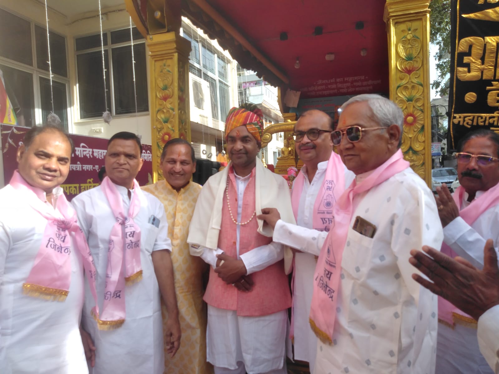 जयपुर। जैन धर्म के प्रथम तीर्थंकर भगवान ऋषभदेव की जन्म जयंती के पावन अवसर पर पांच जैन तीर्थंकरों की पावन जन्मभूमि शाश्वत तीर्थ अयोध्या के विकास एवं पूरे देश में जन-जन की आस्था के लिए परम पूज्य गणिनी प्रमुख श्री ज्ञानमति माताजी की प्रेरणा से प्रवर्तित अयोध्या तीर्थ प्रभावना रथ का 3 अप्रैल बुधवार को गायत्री नगर , महारानी फार्म, दिगंबर जैन मंदिर में आगमन होने पर मंदिर प्रबंध समिति के अध्यक्ष कैलाश छाबड़ा, उपाध्यक्ष अरुण शाह, मंत्री राजेश बोहरा, कोषाध्यक्ष राकेश छाबड़ा, संयुक्त मंत्री मुकेश सोगानी आदि पदाधिकारियों ने भव्य स्वागत किया।