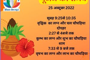 पूजन का समय 25 अक्टूबर 2022 सुबह 9:25से 10:35 वृश्चिक का लग्न और चल चौघड़िया दोपहर 2:27 से 4बजे तक कुम्भ का लग्न और शुभ का चौघड़िया शाम 7:33 से 9 बजे तक...