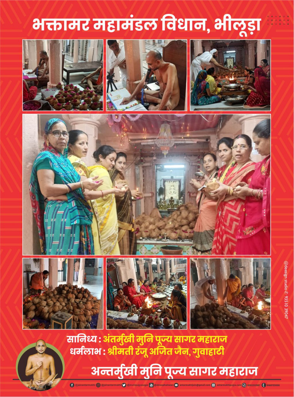 भीलूड़ा। अन्तर्मुखी मुनि पूज्य सागर महाराज की 48 दिवसीय मौन साधन चल रही है। उसके अंतर्गत शुक्रवार को भक्तामर विधान के 19वें दिन गुवाहाटी निवास श्रीमती रंजू अजित...