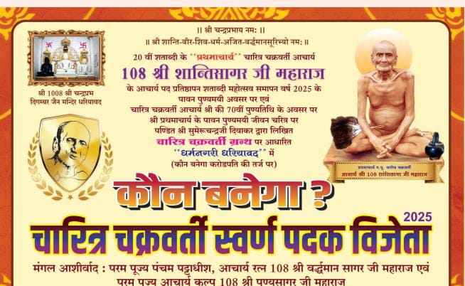 धरियावद के श्री चंद्रप्रभ दिगंबर जैन मंदिर में 22 से 25 अगस्त तक चारित्र चक्रवर्ती स्वर्ण पदक विजेता प्रतियोगिता का आयोजन होगा। यह आयोजन बीसवीं सदी के प्रथमाचार्य आचार्य 108 श्री शांतिसागर जी महाराज की आचार्य पद प्रतिष्ठापन शताब्दी और 70वीं पुण्यतिथि के अवसर पर किया जा रहा है। प्रतियोगिता सुमेरु चंद्र दिवाकर द्वारा लिखित ग्रंथ पर आधारित होगी, जिसका आयोजन कंप्यूटर प्रणाली से कौन बनेगा करोड़पति की तर्ज पर होगा।
