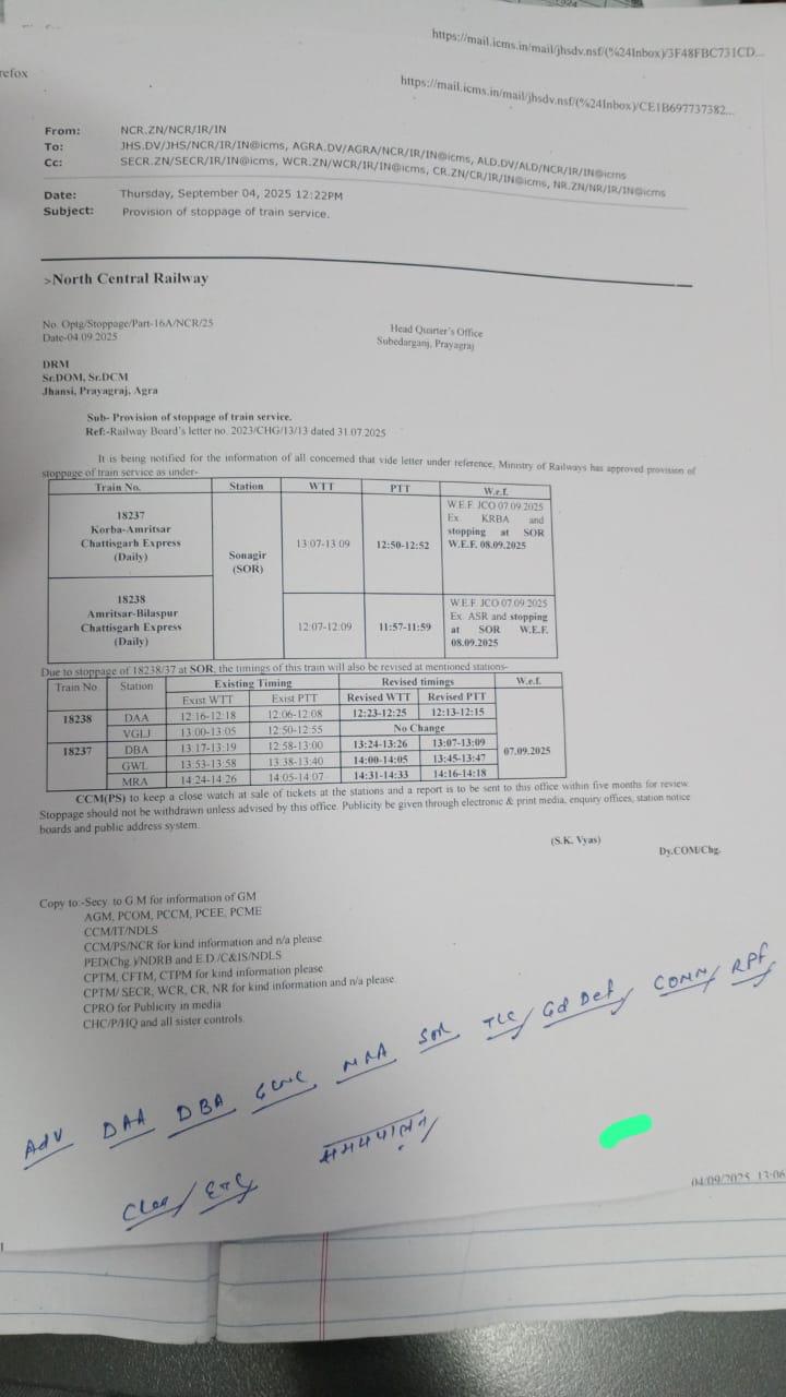 रेलवे की नई घोषणा के अनुसार ट्रेन क्रमांक 18237/18238 छत्तीसगढ़ एक्सप्रेस 08 सितम्बर से सोनागिर स्टेशन पर रुकेगी। यह ठहराव अभी 6 माह के लिए अस्थायी रूप से स्वीकृत किया गया है। यदि इस अवधि में प्रतिदिन 5 यात्रियों की आवक-जावक सोनागिर स्टेशन से दर्ज होती है, तो स्टॉपेज स्थायी कर दिया जाएगा।