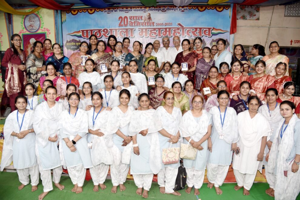 ललितपुर। आचार्य श्री विद्यासागर महाराज के आशीर्वाद से नगर में संचालित 10 पाठशालाओं के 20 साल पूर्ण होने पर पार्श्वनाथ दिगम्बर जैन अटामंदिर से आचार्य श्री विशुद्धसागर महाराज के शिष्य मुनि श्री सौम्यसागर महाराज एवं मुनि श्री जयेन्द्र सागर महाराज के सानिध्य में 20 साल बेमिसाल पाठशाला महोत्सव का आयोजन दिगंबर जैन पंचायत समिति के तत्वावधान में इन दिनों चल रहा है। पाठशालाओं के संचालक बाल बह्मचारी विधानाचार्य मनोज भैया के मार्गदर्शन में सिद्धचक महामंडल विधान में प्रातःकाल पूजन, अभिषेक, शांतिधारा के उपरांत इंद्र-इंद्राणियों द्वारा भक्तिपूर्वक अर्घ्य समर्पित हो रहे हैं। सायंकाल पाठशाला के बच्चों एवं उनको निस्वार्थ धार्मिक एवं संस्कारों का शिक्षण देने वाली दीदीयों ने आकर्षक प्रेरक सांस्कृतिक प्रस्तुतियां दी। इसका शुभारंभ आशु जैन कुमहेड़ी ने मंगलाचरण एवं शांतिनाथ मंदिर गांधीनगर पाठशाला के बच्चों ने भक्ति नृत्य से किया।