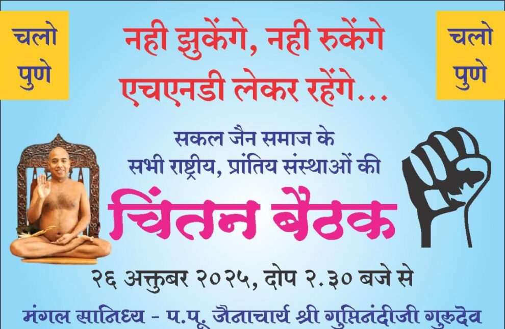 सकल जैन समाज के सभी राष्ट्रीय और प्रांतीय संस्थाओं की एचएनडी हॉस्टल के मुद्दे पर चिंतन बैठक आचार्यश्री गुप्तिनंदी के मंगल सान्निध्य में 26 अक्टूबर को दोपहर ढाई बजे से होगी। बैठक की अध्यक्षता पूर्व सांसद राजू शेट्टी करेंगे। पुणे से पढ़िए, यह खबर…