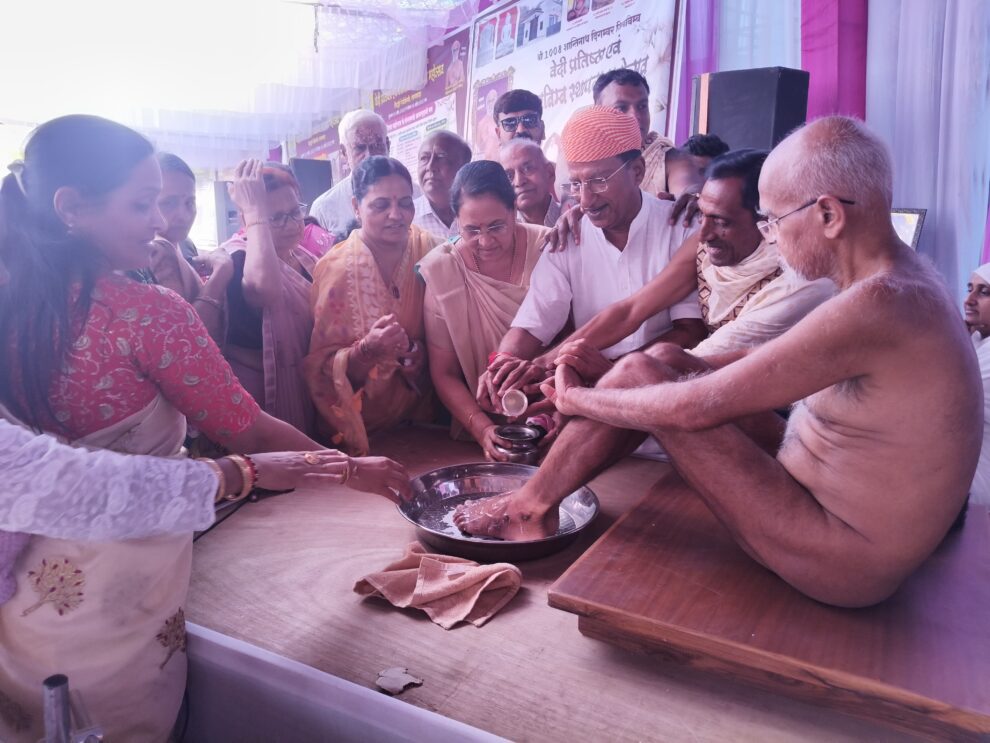 सागवाड़ा। नगर के डूंगरपुर रोड स्थित सिद्धि रेजीडेंसी आवासिय कॉलोनी के दिगंबर जैन समाज की ओर से नवनिर्मित भगवान शांतिनाथ दिगंबर जैन मंदिर में नूतन वेदी पर जिन प्रतिमा स्थापना, मंदिर शिखर पर कलश तथा ध्वजादंड स्थापना के लिए तीन दिवसीय वेदी प्रतिष्ठा महोत्सव के दूसरे दिन मुनि श्री आज्ञा सागर जी महाराज ससंघ के सानिध्य तथा प्रतिष्ठाचार्य पंडित विनोद पगारिया ‘विरल’ के तत्वावधान में शनिवार को विविध धार्मिक अनुष्ठान हुए। सिद्धि रेजीडेंसी जैन समाज के अध्यक्ष गिरिश शाह ने बताया कि तीन दिवसीय वेदी प्रतिष्ठा महोत्सव के दूसरे दिन शनिवार को प्रातः मुनि श्री आज्ञा सागरजी महाराज, आर्यिका सुप्रज्ञाश्री माताजी संघ के सानिध्य में प्रतिष्ठाचार्य विनोद पगारिया के मंत्रोच्चारण के साथ मूलनायक शांतिनाथ भगवान की प्रतिमा, आदिनाथ भगवान, वासुपूज्य भगवान, पारसनाथ भगवान की प्रतिमाओं पर इंद्र-इंद्राणी समूह की ओर से विविध द्रव्य पूरित कलशों से अभिषेक किया गया।