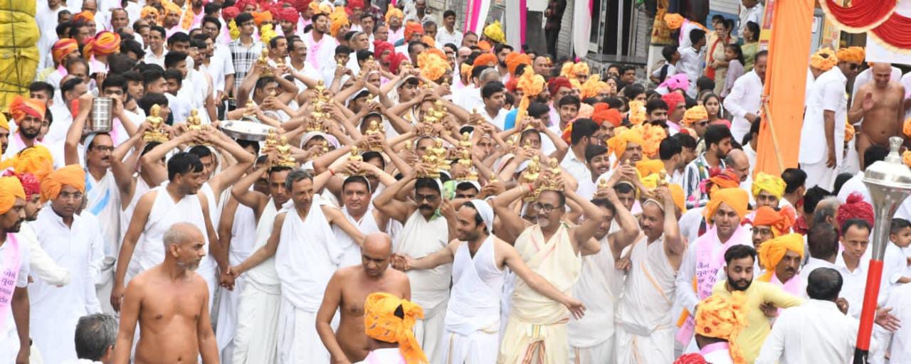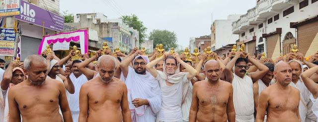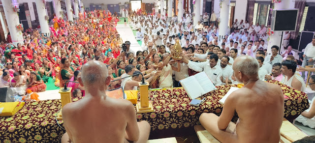 घाटोल। आचार्य श्री विद्यासागर जी महाराज के परम आज्ञानुवर्ती शिष्य मुनि विमल सागर जी, अनंत सागर जी,धर्म सागर जी,भाव सागर जी के नगर में मंगल प्रवेश के दौरान संपूर्ण नगर में भक्तों मैं भक्ति का जनसैलाब उमड़ पड़ा, वहीं जहां इन संतों के नगर आगमन के साथ ही नंदीश्वरद्वीप की रजत जिन मंदिर के साथ ही 52 जिन प्रतिमा के नगर आगमन से भक्तों में उत्साह उमंग एवं भक्ति का ज्वार उम्र पड़ा, जिसने बच्चों से लेकर बुजुर्गों एवं महिलाओं में भी पूर्ण भक्ति भाव से नृत्य करने के लिए मजबूर कर दिया। प्रातः मुनि संघ देवदा से विहार करते हुए घाटोल नगर के समीप आचार्य विद्यासागर महाराज के कीर्ति स्तंभ के समीप जैसे ही पहुंचे, वहां पहले से आगमन को तैयार जैन समाज के संपूर्ण जनमानस ने श्रीफल भेंट करते हुए मुनि संघ को नगर प्रवेश करने का निवेदन किया। तत्पश्चात मुनि संघ नगर में संचालित आचार्य विद्यासागर विद्यालय का अवलोकन किया गया और नगर की ओर प्रस्थान किया।