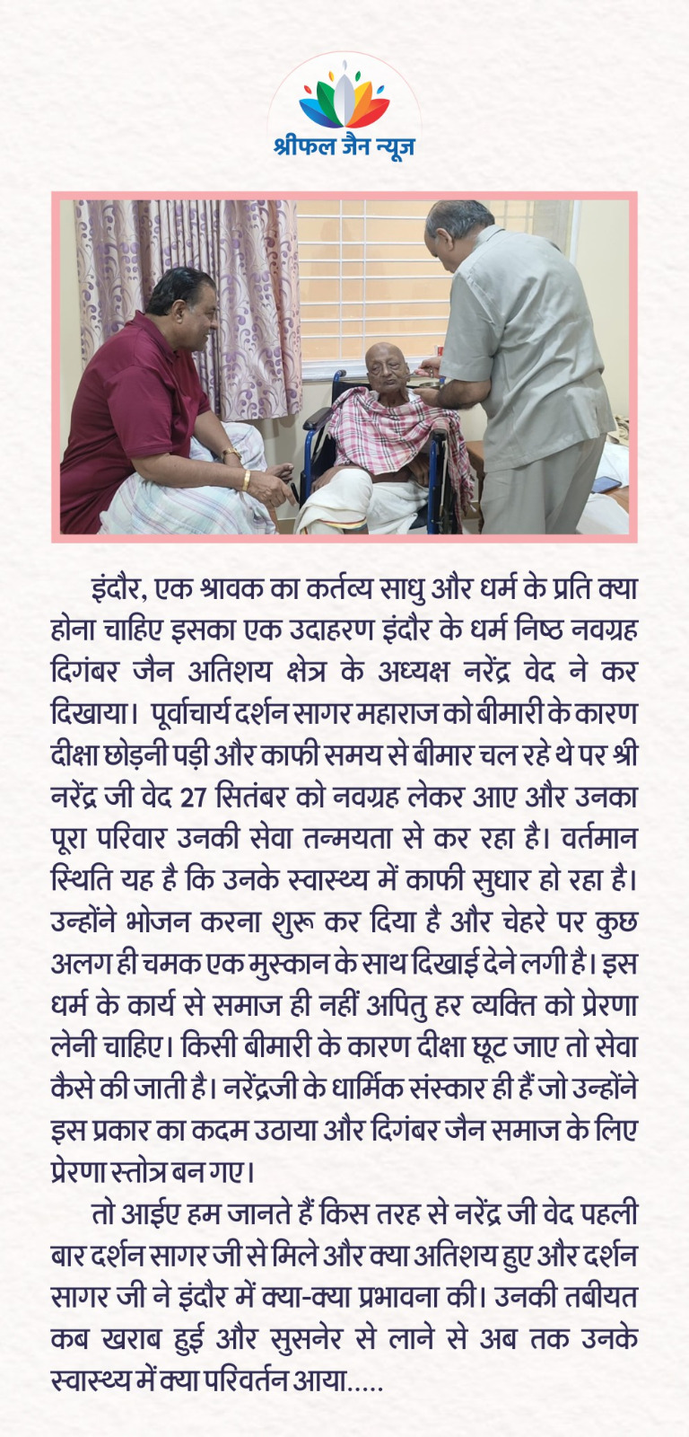 इंदौर, दर्शन सागर जी महाराज को सुसनेर से यहां पर लाने के बाद उनके स्वास्थ्य में थोड़ा-थोड़ा सुधार है। नरेंद्र वेद और उनके परिवार ने महाराज जी की तन्मयता से सेवा की। उसके परिणामस्वरूप उनके स्वास्थ्य में काफी सुधार हो चुका है। पढ़िए रेखा जैन की रिपोर्ट…