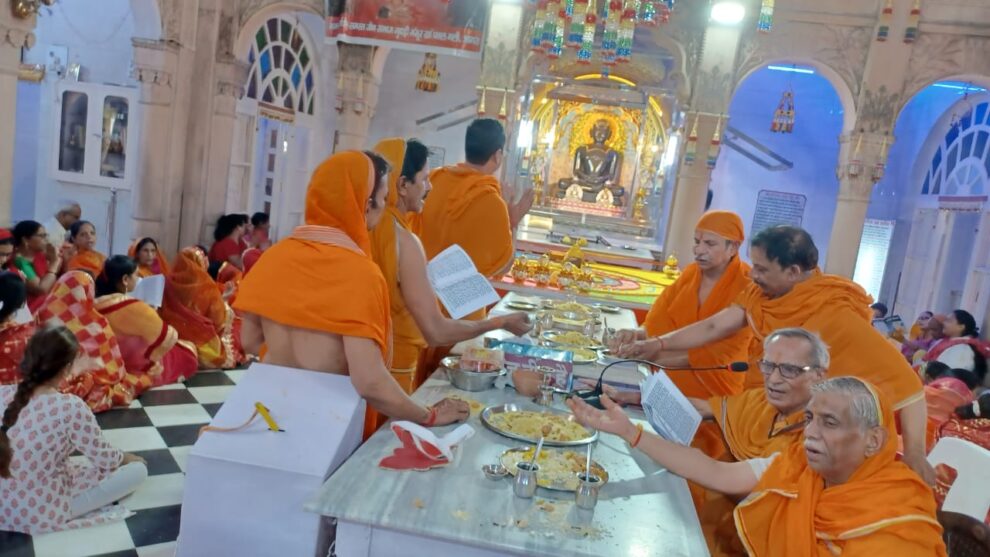 आगरा। आचार्य श्री सौरभ सागर जी महाराज के मंगल आशीर्वाद से एवं गुदड़ी मंसूर खां मंदिर कमेटी के तत्वावधान में आगरा के पत्तल गली स्थित गुदड़ी मंसूर खां के श्री 1008 शीतलनाथ दिगम्बर जैन मन्दिर में 16 दिवसीय श्री शांतिनाथ महामंडल विधान एवं विश्व शांति महायज्ञ का आयोजन बड़े ही भक्तिभाव के साथ चल रहा है।