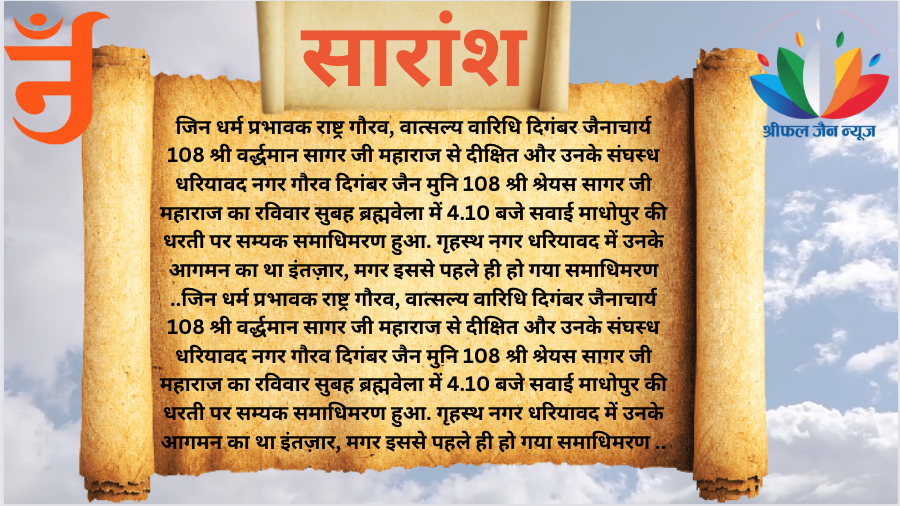 श्रीफल जैन न्यूज के अशोक कुमार जेतावत ने बताया कि आचार्य श्री वर्द्धमान सागर जी महाराज का श्रीमहावीर जी अतिशय क्षेत्र से मार्बल नगरी मदनगंज-किशनगढ़ की ओर विहार चल रहा है। आगामी जनवरी में किशनगढ़ में पंचकल्याणक प्रतिष्ठा महोत्सव होना है। इस बीच शनिवार 17 दिसंबर को मुनि 108 श्री हितेंद्र सागर जी महाराज के गृहनगर में आचार्य संघ का प्रवेश हुआ। हितेंद्र सागर जी की दीक्षा के बाद पहली बार आचार्य संघ जब उनके गृह नगर पहुंचा तो समाज के लोग काफी उत्साहित नजर आए। मगर इसके एक दिन बाद 18 दिसंबर को ही सुबह 4 बजकर 10 मिनट पर संघस्थ मुनिश्री श्रेयस सागर जी महाराज का समाधिमरण से समाज को अपूरणीय क्षति पहुंच गई।