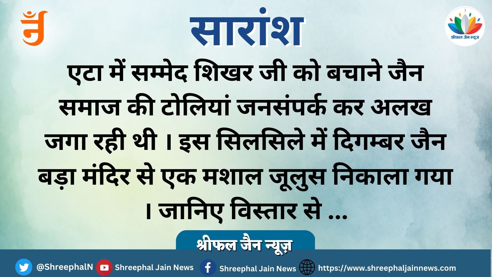 एटा में सम्मेद शिखर को बचाने की मुहिम शुरु हुई । इस मुहिम में बड़ी संख्या मे महिला-पुरुष और युवाओं ने अपनी भागीदारी निभाई । एटा में सम्मेद शिखर को बचाने के नारों के बीच मशाल जुलूस निकाला गया । इस जूलुस में बड़ी संख्या में लोग शामिल हुए ।