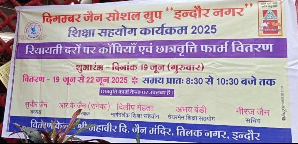 इंदौर नगर दिगंबर जैन सोशल ग्रुप की ओर से विभिन्न मंदिरों में हर साल की तरह 19 जून से प्रारंभ शिक्षा सहयोग छात्रवृत्ति वितरण और रियायती मूल्य पर कापियों का वितरण फेडरेशन एवं समाज के वरिष्ठ जनों की उपस्थिति में प्रारंभ हुआ। इंदौर से पढ़िए, यह खबर…
