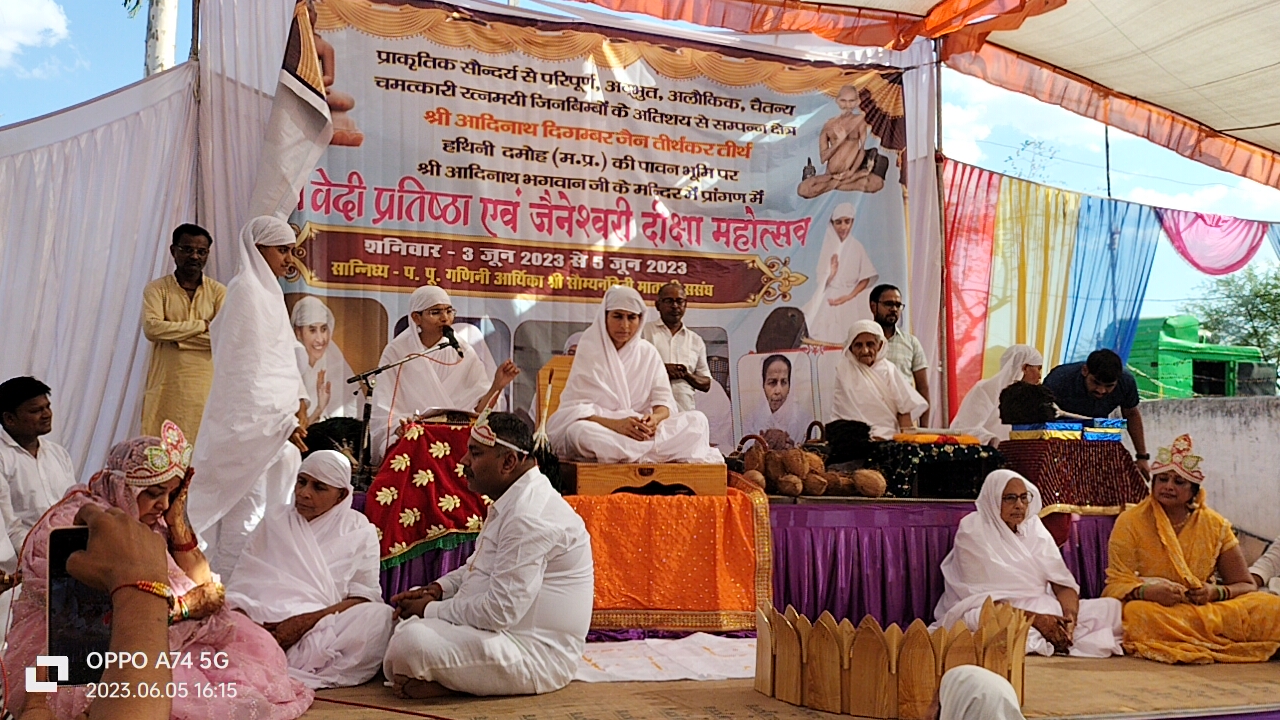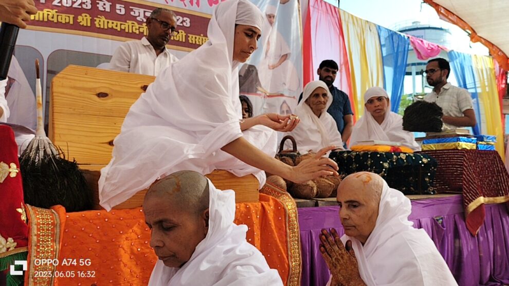 मुरैना। नगर की दोनों विदुषी महिलाएं मंत्रोच्चारण के मध्य जैनेश्वरी क्षुल्लिका आर्यिका दीक्षा ग्रहण कर जैन साध्वी बन गईं। सोमवार को अभिक्ष्ण ज्ञानोपयोगी आचार्य श्री वसुनन्दी महाराज की परम प्रभावक शिष्या गुरुमां गणिनी आर्यिका श्री सौम्य नन्दिनी माताजी को ग्राम हथनी (दमोह) मध्यप्रदेश में मुरैना नगर की दिगम्बर जैसवाल जैन उपरोचियाँ परिवार की रावत गोत्रीय मुरैना नसियां जी जैन मंदिर के सामने निवासी पवन जैन (रतीराम पुरा बाले) की मातुश्री ब्रह्मचारणी बहिन मीना जैन व संतोष, नीलेश, दीपक जैन की मातुश्री कोलनायक गोत्रीय रामकली जैन ने आत्म कल्याण के लिए श्रीफ़ल अर्पित कर दीक्षा का निवेदन किया। उनके निवेदन एवं दृढ़ इच्छा शक्ति को देखते हुए समस्त आर्यिका संघ, त्यागिवर्तियों, दोनों बहिनों के परिजनों, रिश्तेदारों एवं हजारों की संख्या में उपस्थित सधर्मी बन्धुओं से दीक्षा के लिए स्वीकृति प्राप्त की।