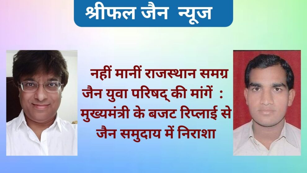 जयपुर l प्रदेश के मुख्यमंत्री अशोक गहलोत के द्वारा विधानसभा में दिए गए रिप्लाई भाषण में राजस्थान समग्र जैन युवा परिषद् की मांगों को नहीं माने जाने पर प्रदेशभर के जैन समुदाय के युवा वर्ग में घोर निराशा के साथ भारी आक्रोश व्याप्त है, जो की वर्तमान सरकार के लिए आगामी चुनाव के लिए ठीक नहीं है l इस अवसर पर राजस्थान समग्र जैन युवा परिषद् के अध्यक्ष जिनेन्द्र जैन ने बताया कि सबको देते-देते नहीं थकने वाले मुख्यमंत्री अल्पसंख्यक वर्ग के जैन समुदाय के युवा वर्ग एवं समाज श्रेष्ठियों तथा संतों की मांगों को कैसे भूल गए, ये समझ से परे है जबकि जननायक का तो इस समुदाय से गहरा लगाव है।