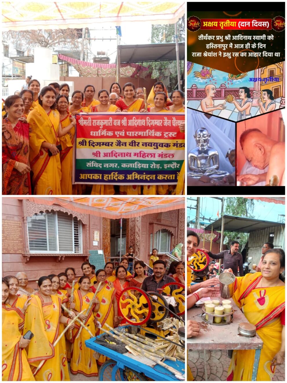 इंदौर(राजेश जैन दद्दू)। आदिनाथ दिगंबर जैन महिला मंडल कनाडिया रोड सविंदनगर द्वारा अक्षय तृतीया के पावन दिवस पर मंदिर जी के बाहर इक्षु रस वितरण किया गया और दयोदय गोशाला रेवती रेंज के लिए पशु आहार की एक गाड़ी घास राशि दान की गई।