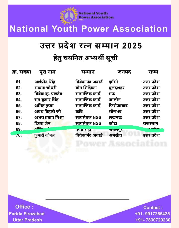 इंदौर। नेशनल यूथ अवार्ड प्राप्त पर्यावरण मित्र दिव्या कुमारी जैन को उत्तरप्रदेश रत्न सम्मान 2025 से सम्मानित किया जाएगा। पर्यावरण संरक्षण और सामाजिक चेतना का अभियान चला रही नेशनल यूथ अवार्ड प्राप्त पर्यावरण मित्र दिव्या जैन को नेशनल यूथ पावर एसोसिएशन की ओर से उत्तर प्रदेश रत्न सम्मान 2025 से नवाजा जाएगा।