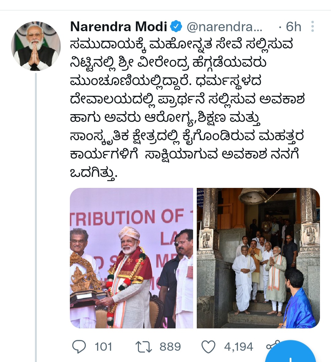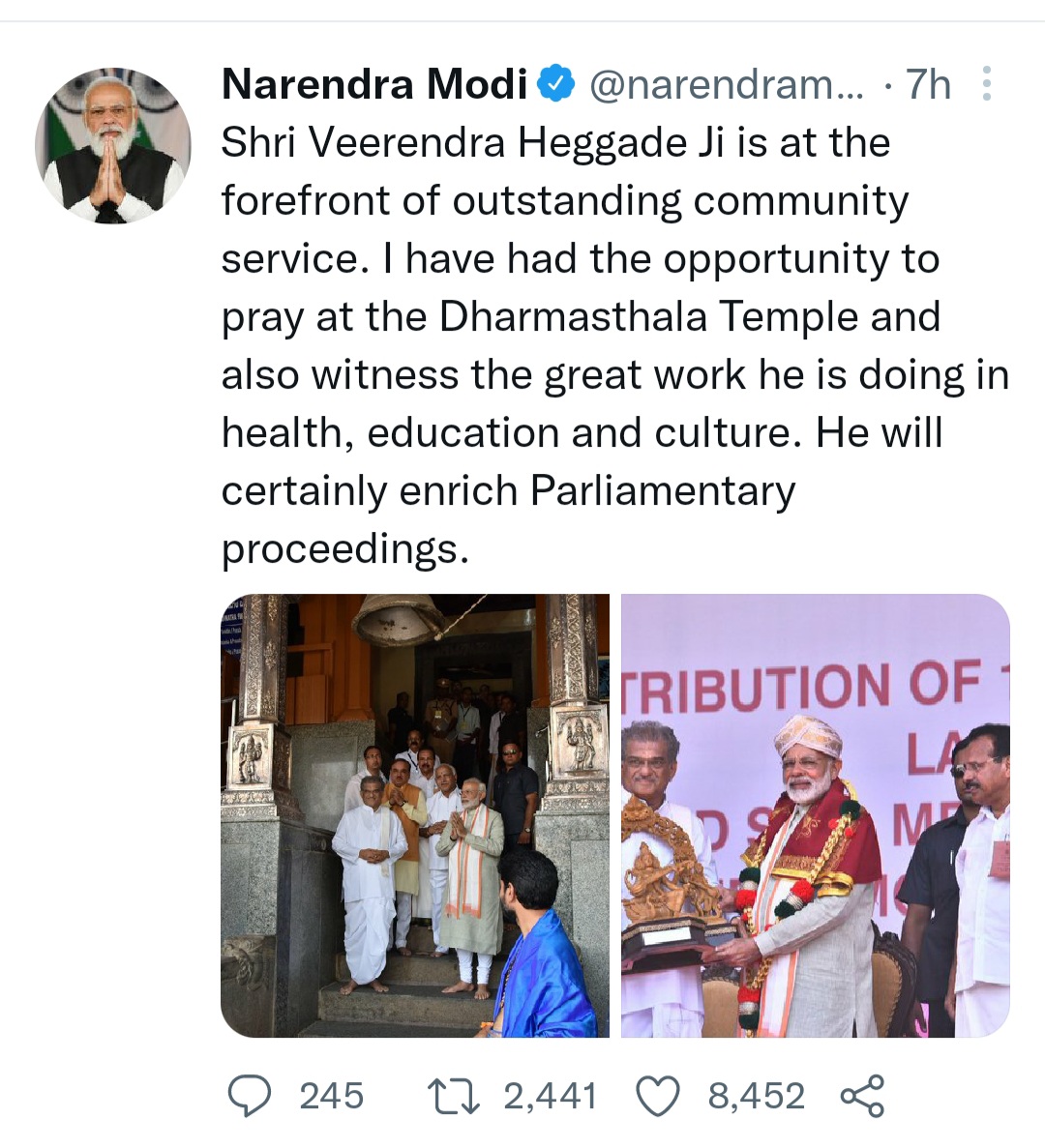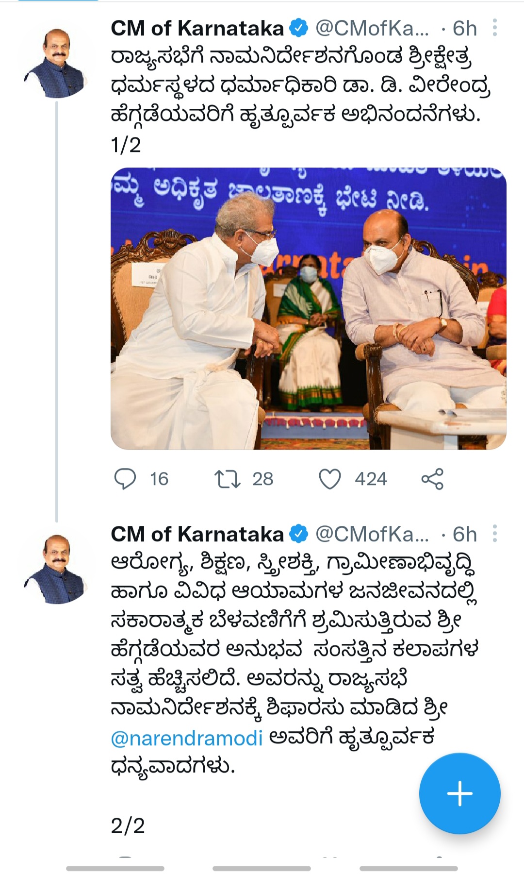 श्री नरेंद्र मोदी जी, इस भाव के लिए मैं आपको धन्यवाद देता हूं। देश के सबसे प्रतिष्ठित कार्यालयों में से एक के लिए नामांकित होना एक बहुत बड़ा सम्मान है। मुझ पर आपके निरंतर विश्वास और मेरी गतिविधियों के लिए आपकी मान्यता के लिए मैं आपको धन्यवाद देता हूं। मैं इस प्रतिष्ठित नामांकन को पूरे देश में अपनी सेवा का दायरा बढ़ाने का अवसर मानता हूं। भगवान मंजुनाथ स्वामी आपको सफलता और अच्छे स्वास्थ्य का आशीर्वाद दें।