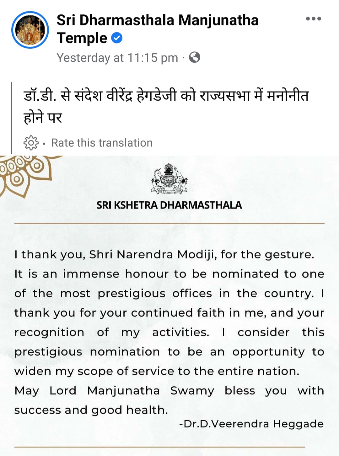 डॉ. डी वीरेन्द्र हेगड़े ने राज्यसभा सदस्य मनोनीत होने पर अपने फेसबुक पेज पर सन्देश दिया ।