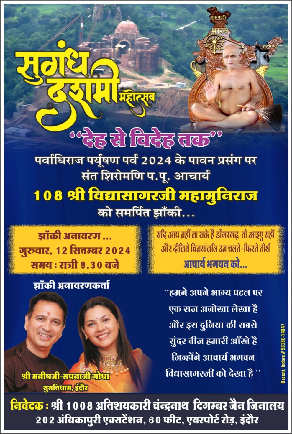 डोंगरगढ़। चंद्रनाथ जिनालय के द्वितीय वर्ष भी एक अनुपम प्रतिकृति (झांकी) देह से विदेह तक का आज अनावरण होने जा रहा है। इस झांकी के माध्यम से आचार्य श्री विद्यासागर जी को विनयांजलि दी जा रही है। झांकी अनावरण समाज श्रेष्ठी मनीष- सपना गोधा द्वारा किया जाएगा। अनावरण आज रात 9.30 बजे चंद्रनाथ जिनालय परिसर में होगा।