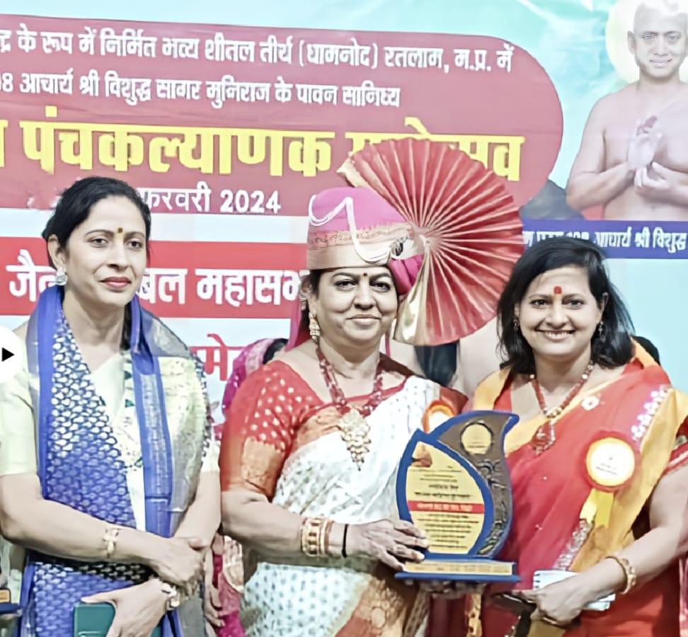 रतलाम। परम पूज्य आचार्य श्री विशुद्ध सागर जी महाराज ससंघ एवं परम पूज्य आचार्य श्री सुंदर सागर जी महाराज ससंघ के पावन सानिध्य एवं आशीर्वाद से श्री दिगंबर जैन ग्लोबल महासभा के महिला वूमेन फोरम का राष्ट्रीय महिला सम्मेलन रतलाम में स्थित शीतल तीर्थ में हो रहे राष्ट्रीय पंचकल्याणक में संपन्न हुआ। बाल ब्रह्मचारी सविता दीदी के मार्गदर्शन में ग्लोबल महासभा के राष्ट्रीय अध्यक्ष जमनालाल जैन हपावत व ग्लोबल वूमेन फोरम की राष्ट्रीय अध्यक्ष सुजाता शाह एवं नीति आयोग की सदस्या एवं महिला सम्मेलन की मुख्य अतिथि अर्चना जैन एवं गणमान्य अतिथियों ने जिनधर्म रक्षक विदुषी डॉ. इन्दु जैन राष्ट्र गौरव को जैनधर्म, संस्कृति प्राकृत-संस्कृत-हिन्दी भाषा, ब्राह्मी लिपि, कला, साहित्य, पत्रकारिता, समाजसेवा, जीवदया-शाकाहार आदि के क्षेत्र में निरंतर कार्य करने ,नवीन संसद भवन के भूमि पूजन-उद्घाटन समारोह आदि अनेक विशेष आयोजनों में राष्ट्रीय-अंतरराष्ट्रीय स्तर पर जैनधर्म का प्रतिनिधित्व करने के लिए “ग्लोबल जैन सशक्त महिला पुरस्कार” से सम्मानित किया।
